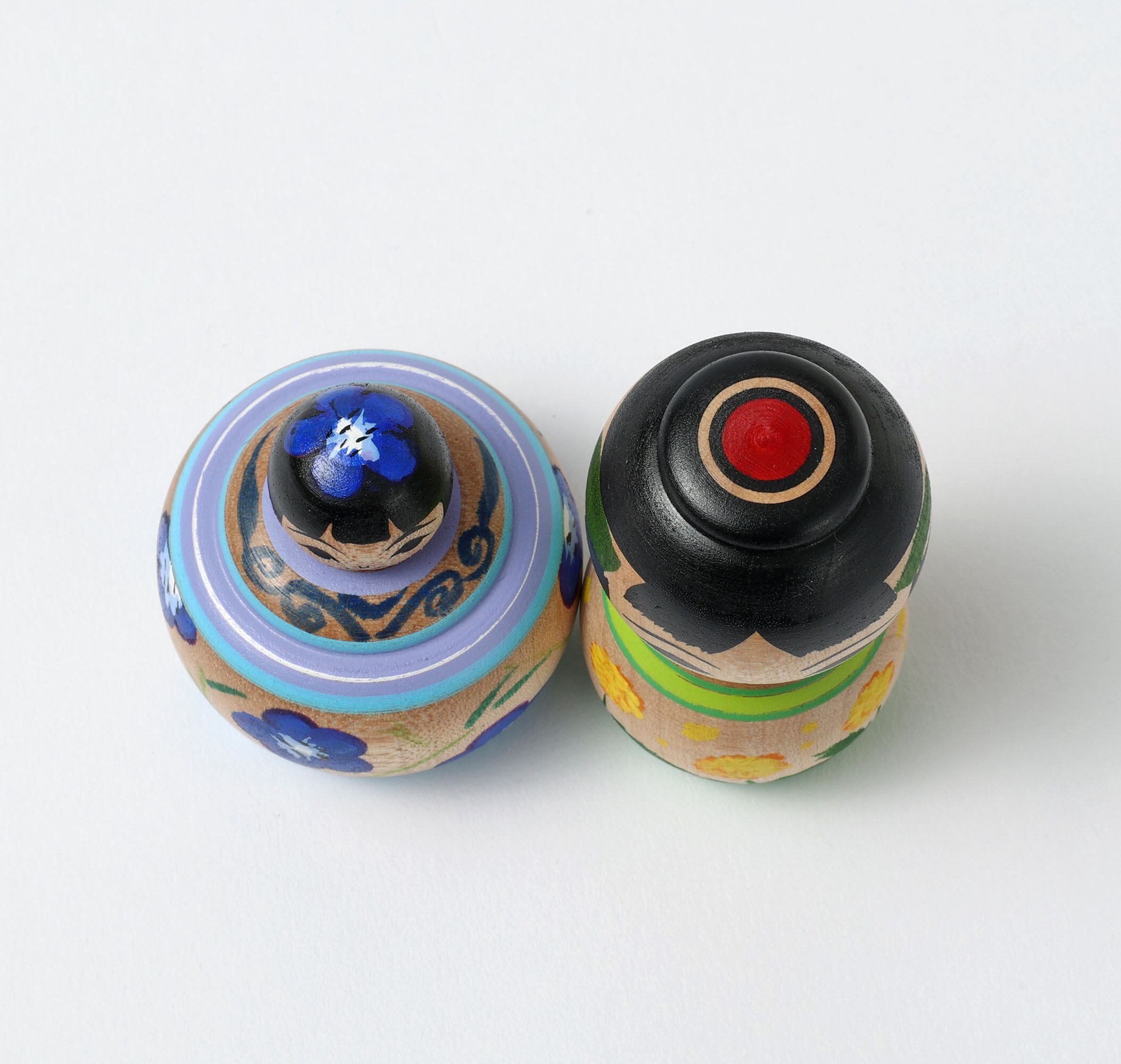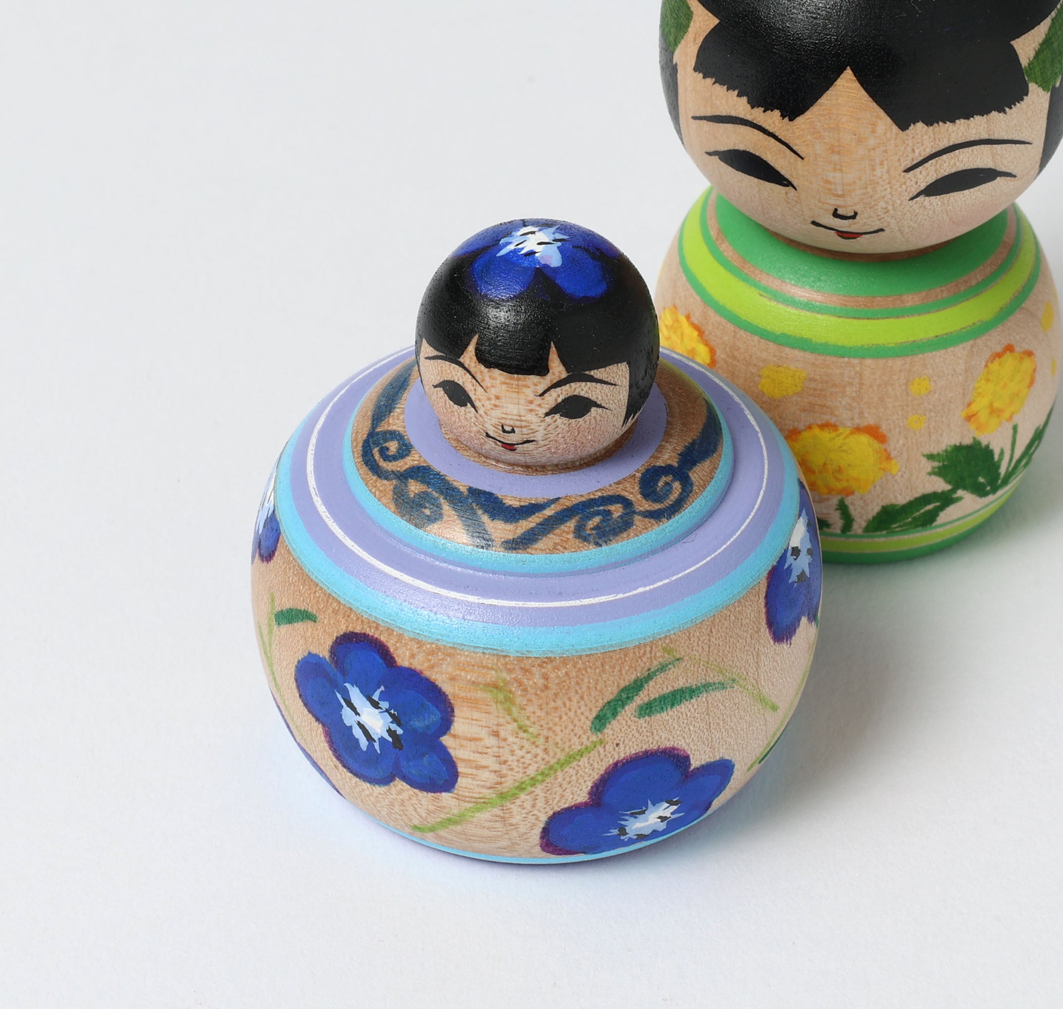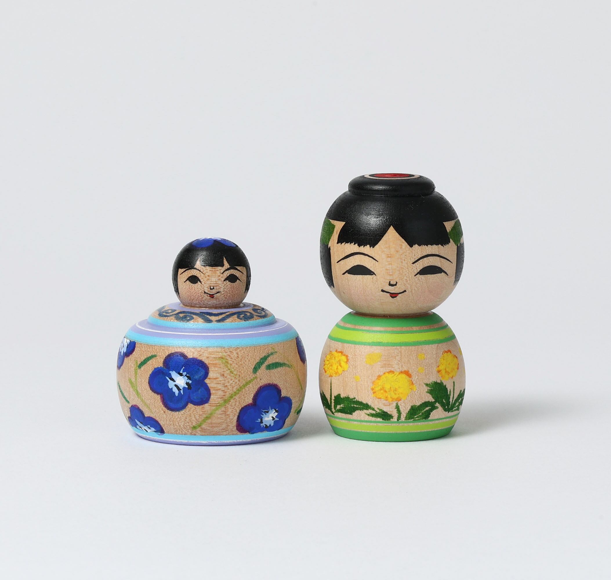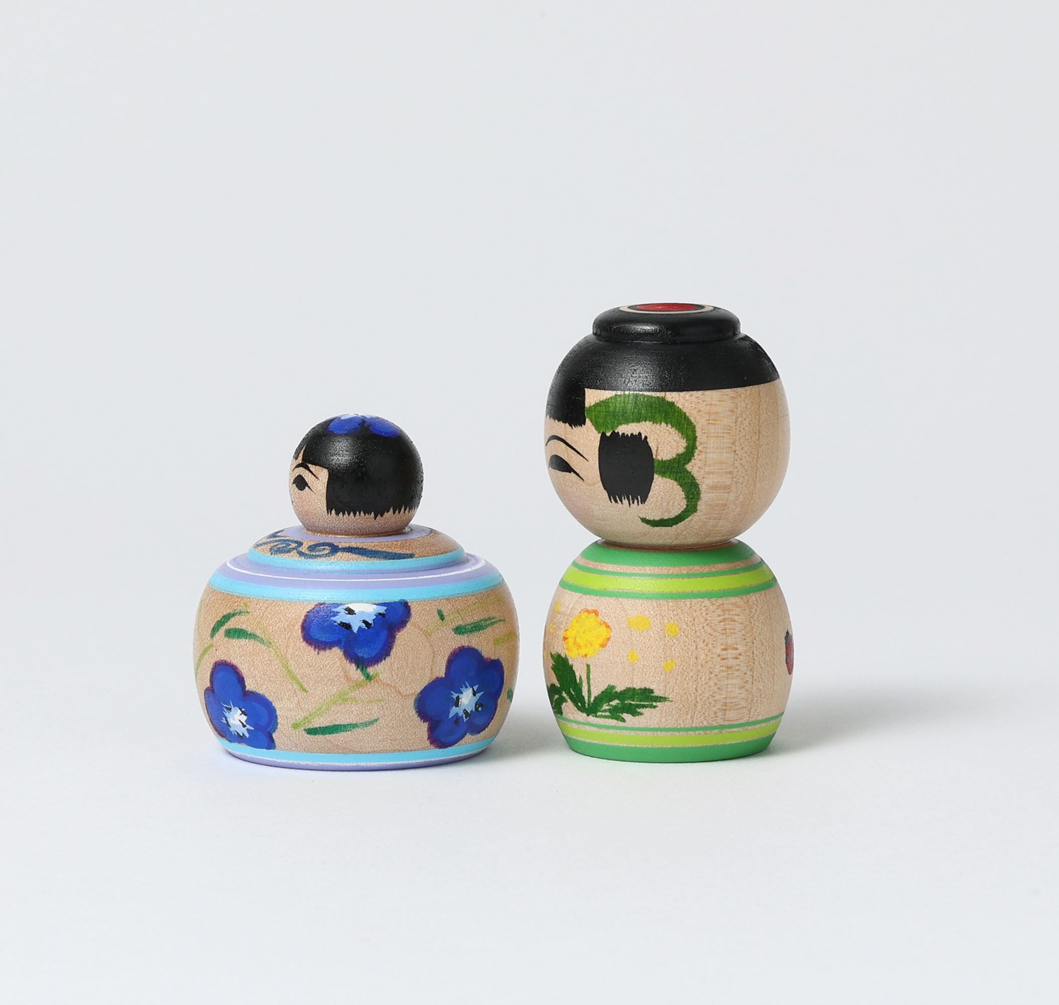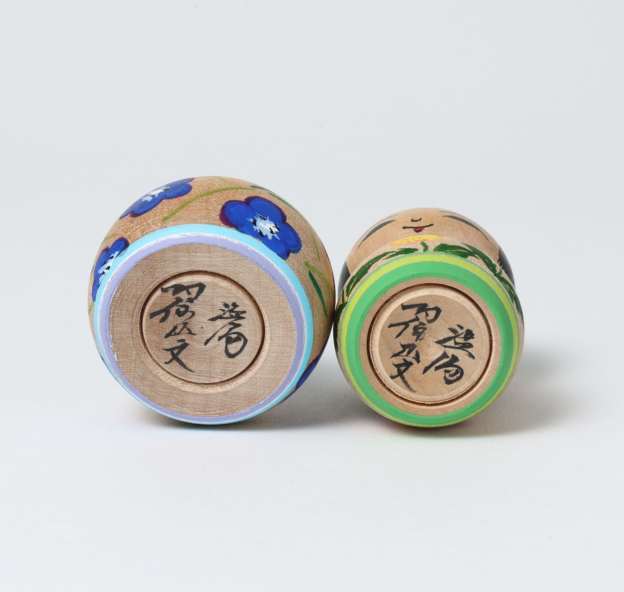 津軽系こけしの阿保正文工人作、ネモフィラえじことタンポポこけしのセットです。