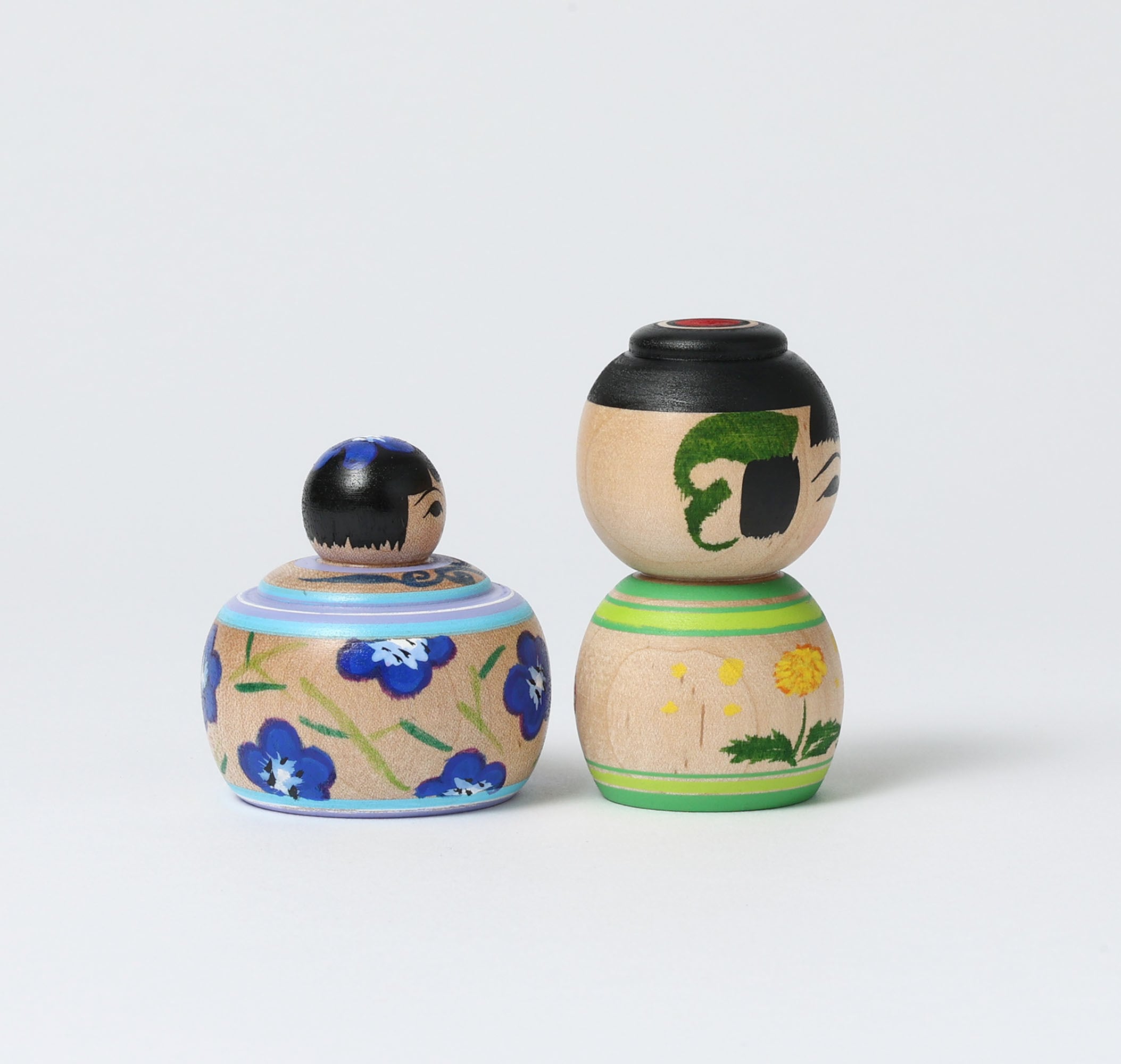 ネモフィラえじことタンポポこけし A set of nemophila and dandelion kokeshi doll | 阿保正文工人 津軽系 Masafumi ABO, Tsugaru style | 高さ6cm