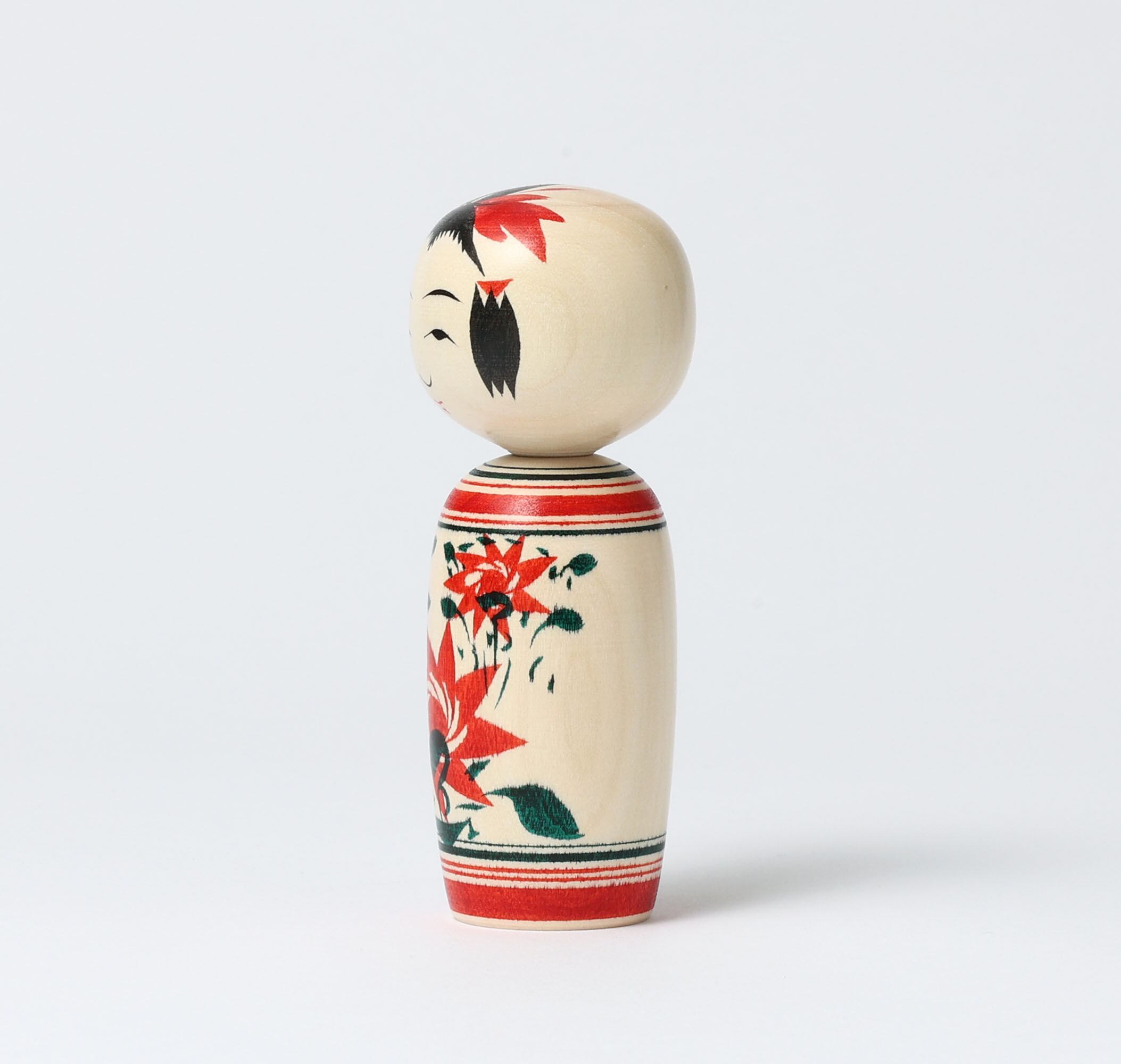 鳴子系こけしの大沼秀顕工人の、鳴子こけしです。車菊の模様が鮮やかなこけしです。