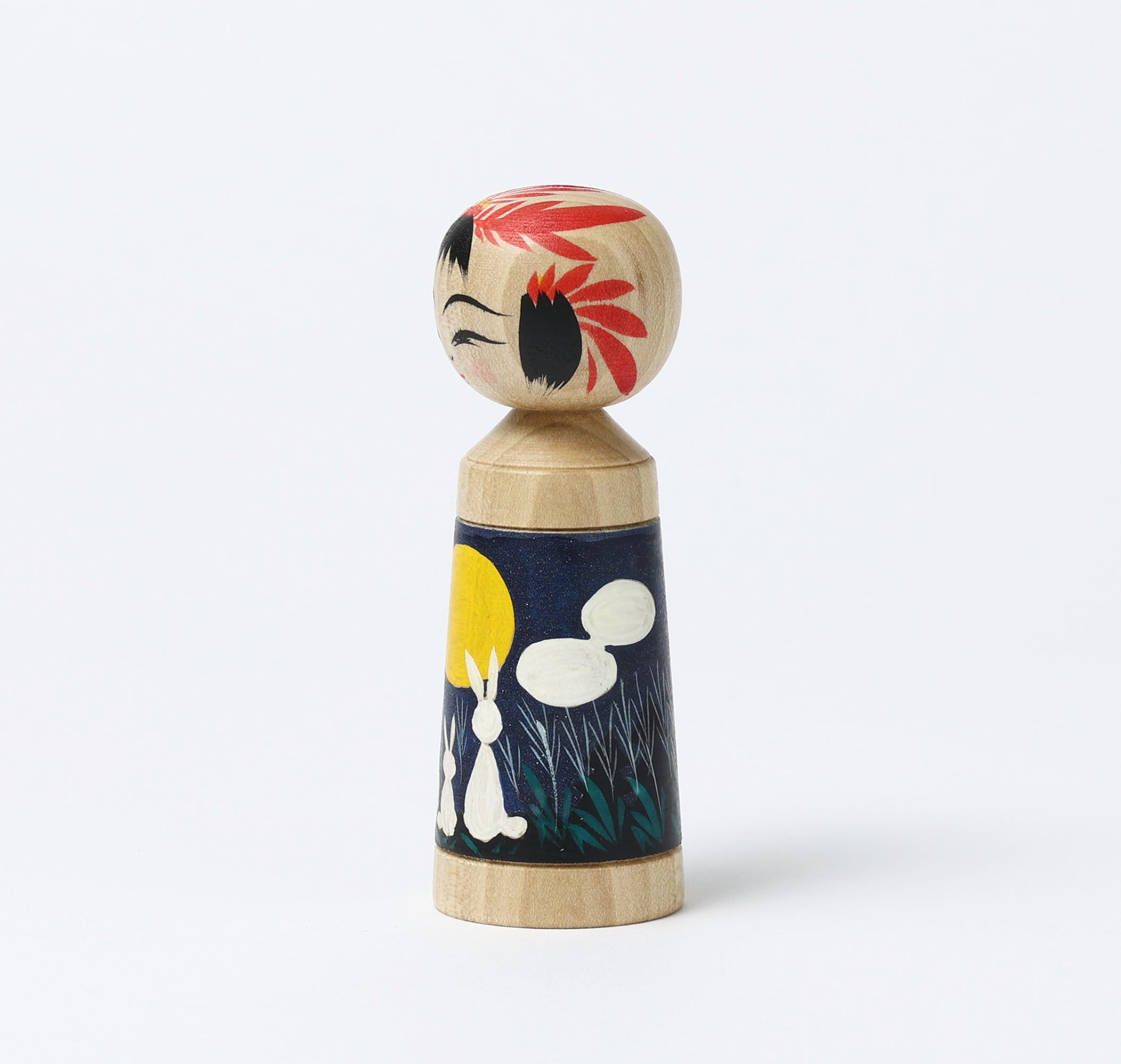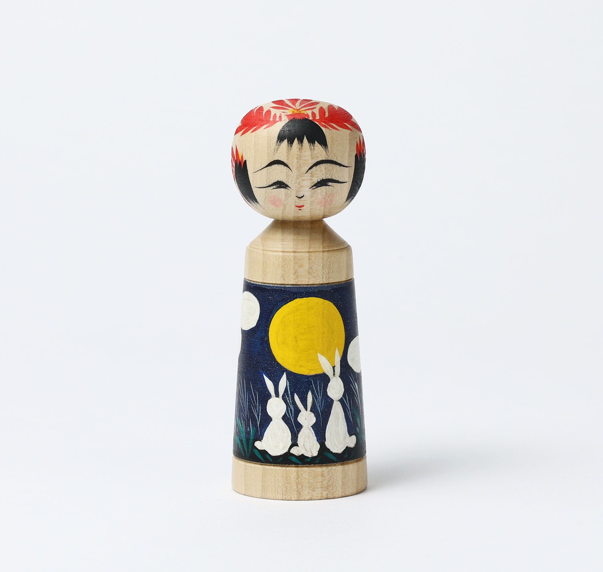作並系こけしの平賀輝幸工人から届いたお月見こけしです。まん丸な月と見上げるうさぎ、月明かりに浮かぶ山や森のシルエットと薄っすらとまかれた銀粉。中秋の名月が輝くこけしです。