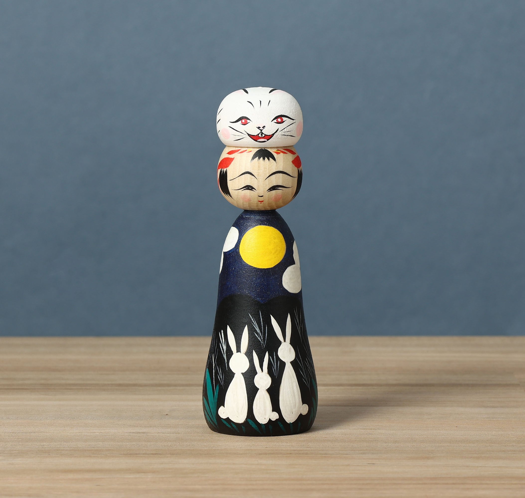 作並系こけしの平賀輝幸工人から届いたお月見こけしです。まん丸な月と見上げるうさぎ、月明かりに浮かぶ山や森のシルエットと薄っすらとまかれた銀粉。中秋の名月が輝くこけしです。頭に乗ったお団子のようなうさぎもかわいらしいです。