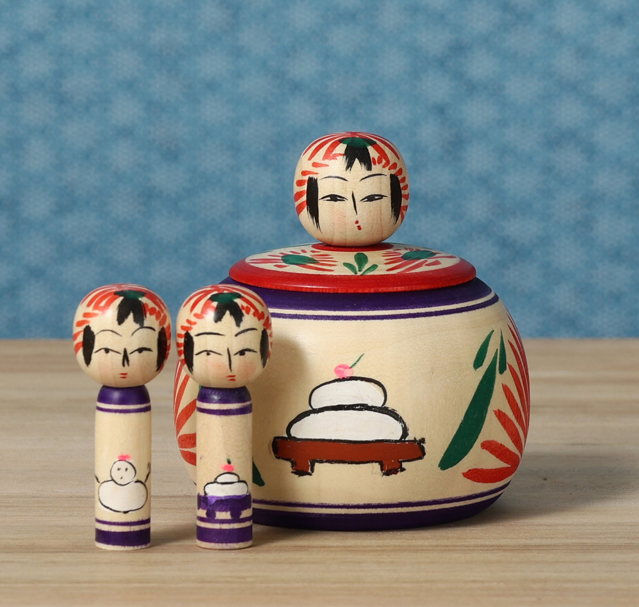 鏡餅と雪だるまが描かれた小さなこけしが入っています。