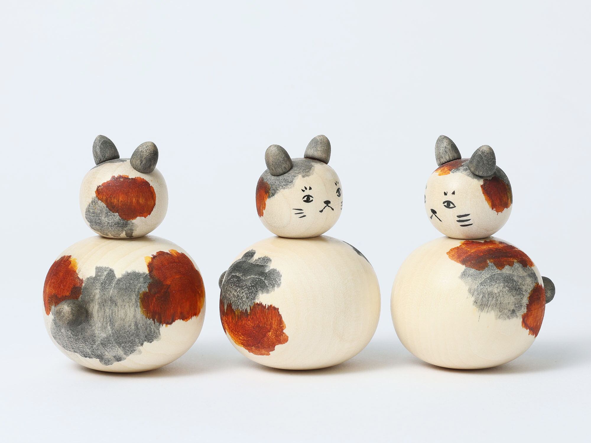 遠刈田系こけしの小山芳美工人から茶色とグレーのトラ、三毛猫、ぶち猫、4種類の猫こけし達が届きました。木地に見える変化はまるで猫の柔らかな毛のようにも見えます。