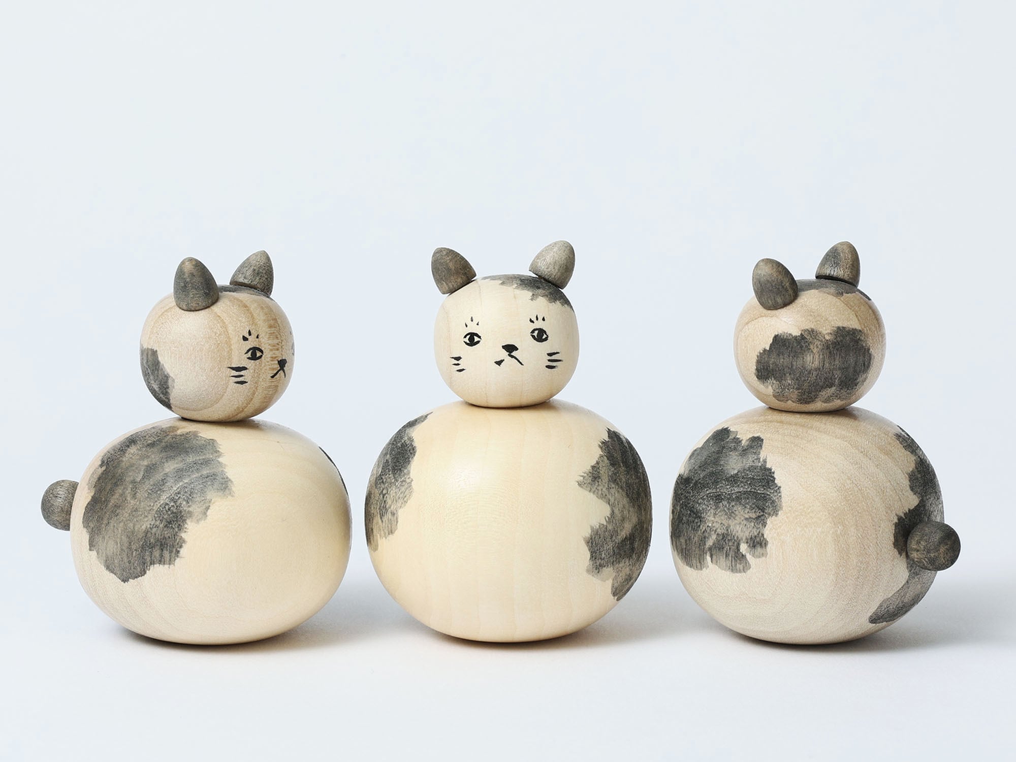 遠刈田系こけしの小山芳美工人から茶色とグレーのトラ、三毛猫、ぶち猫、4種類の猫こけし達が届きました。木地に見える変化はまるで猫の柔らかな毛のようにも見えます。