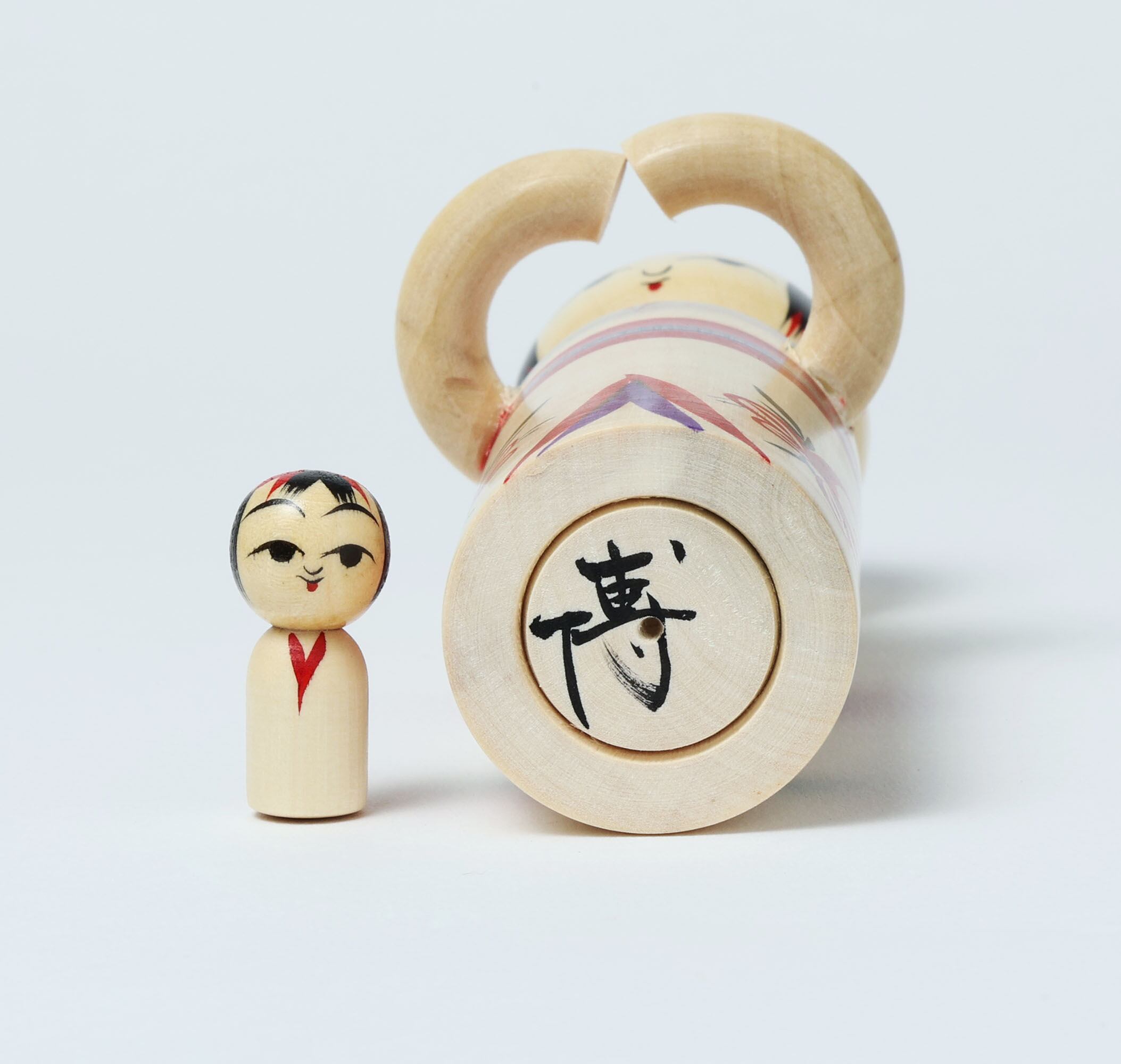 Usually kokeshi dolls a simple dolls, which have only a head and body. He attached arms to his doll to carry a baby, for the first time.