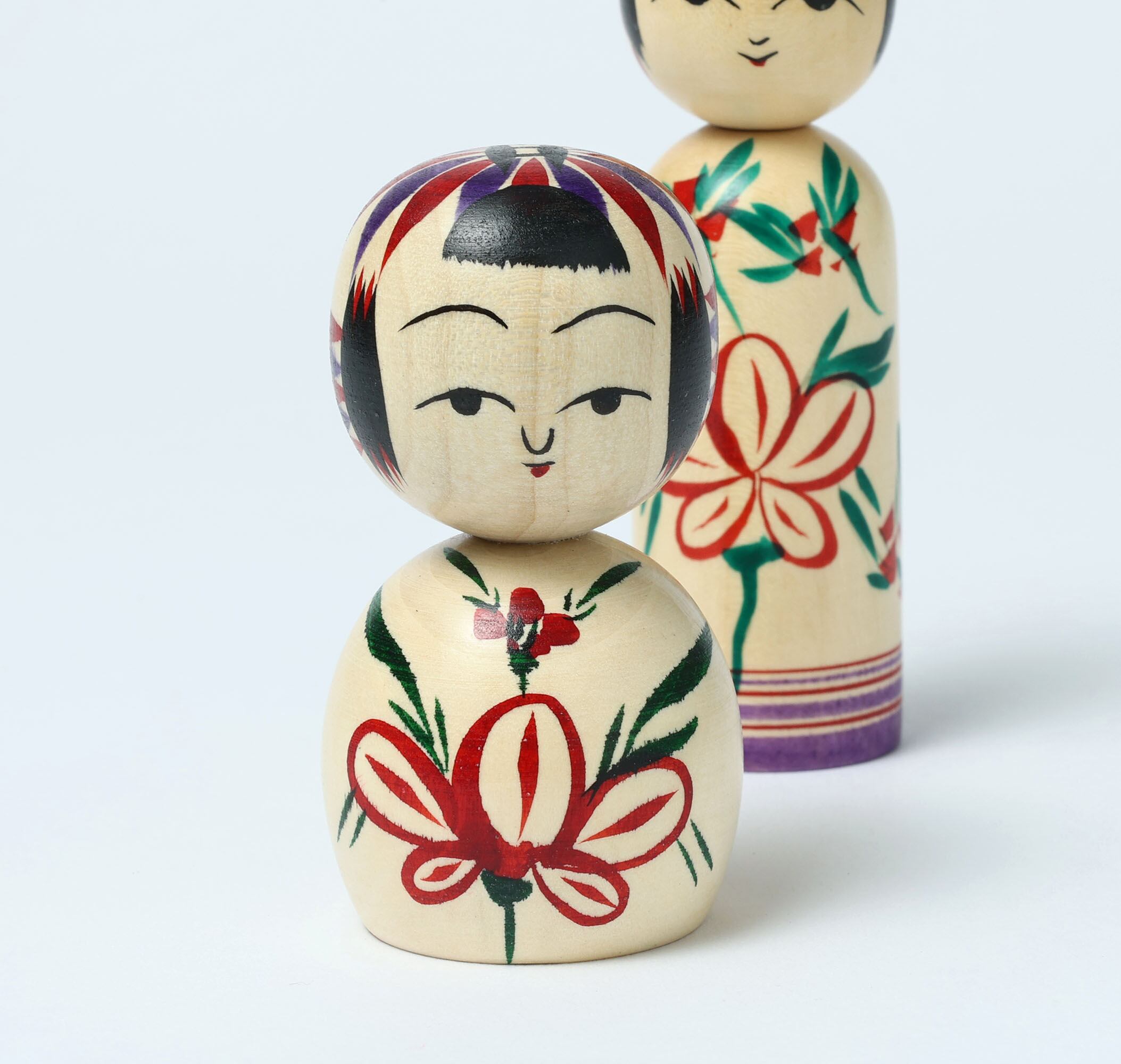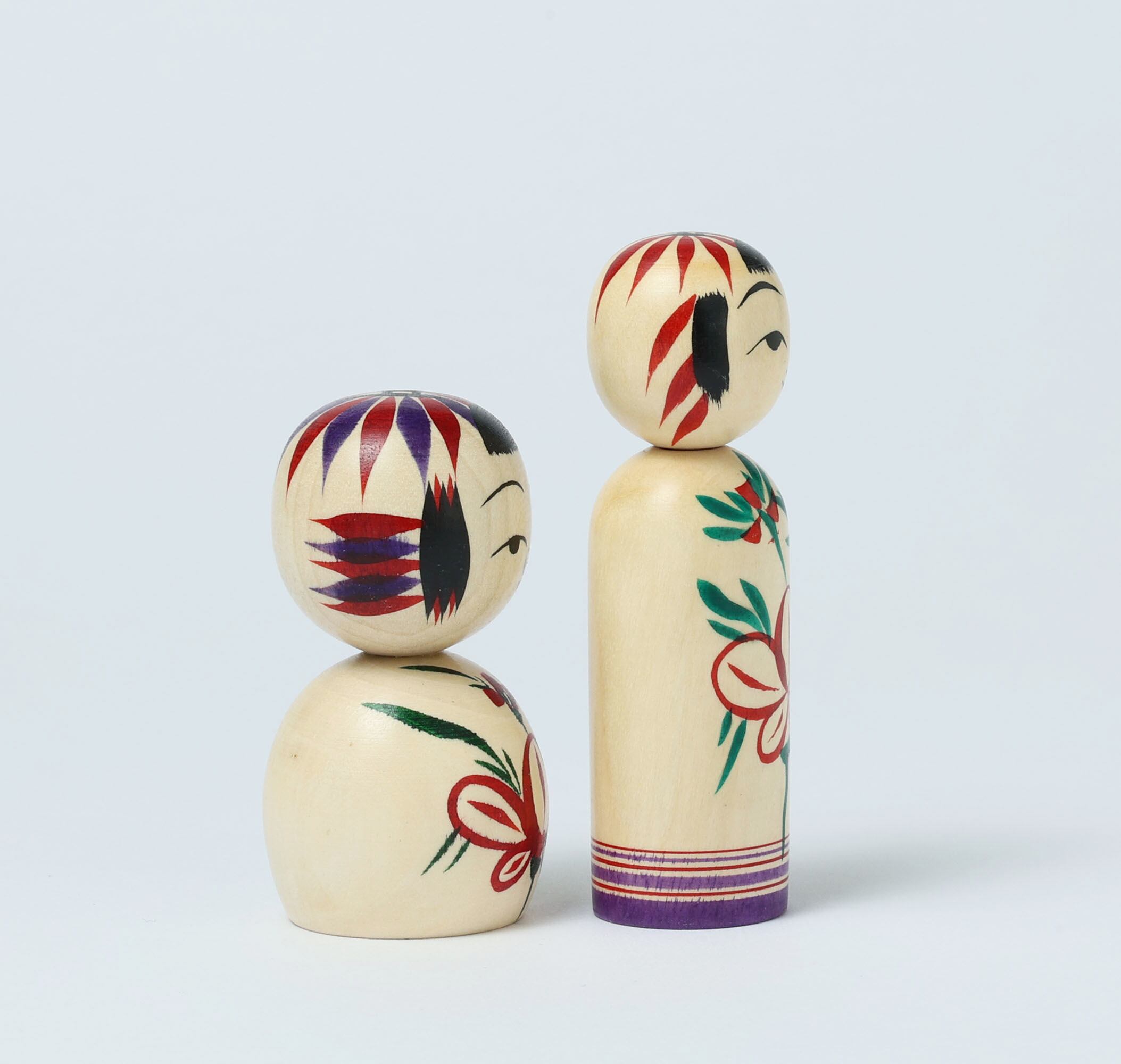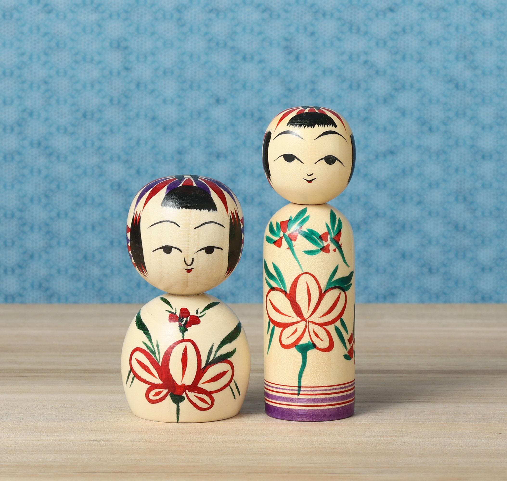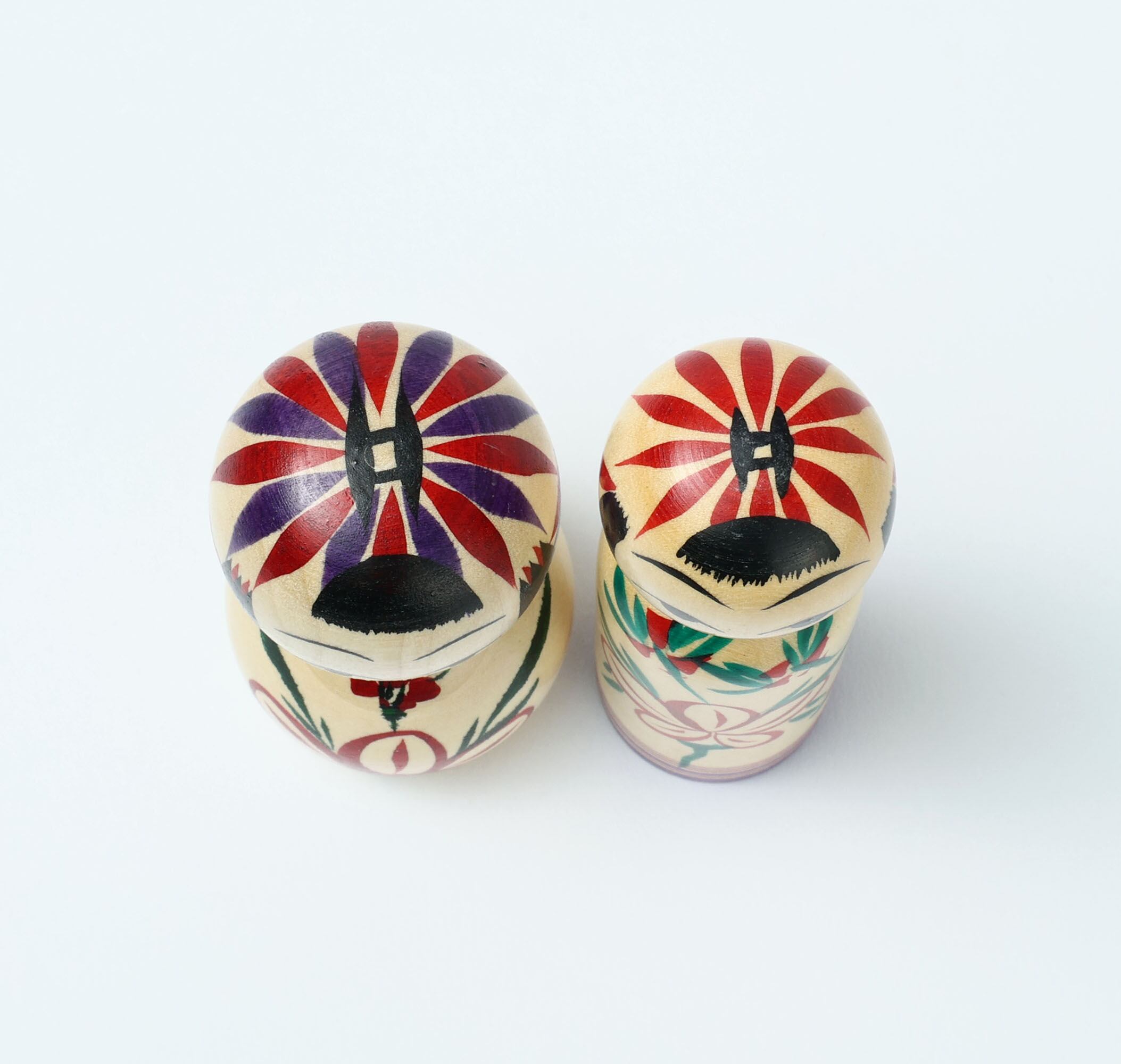 This is a pair of mini kokeshi dolls, by KANO Hiroshi and his son Yohei who are Sakunami style kokeshi craftsmen.