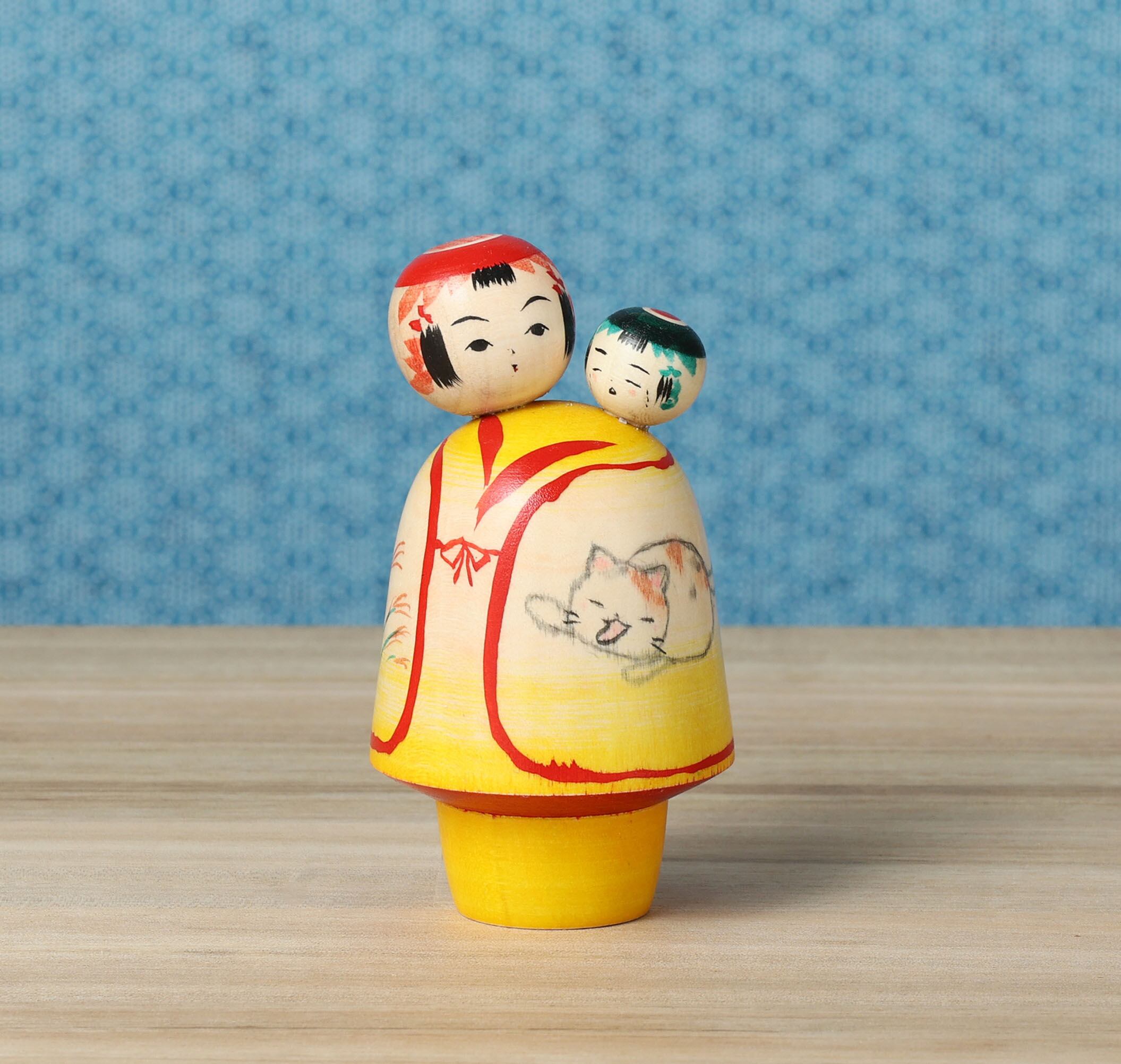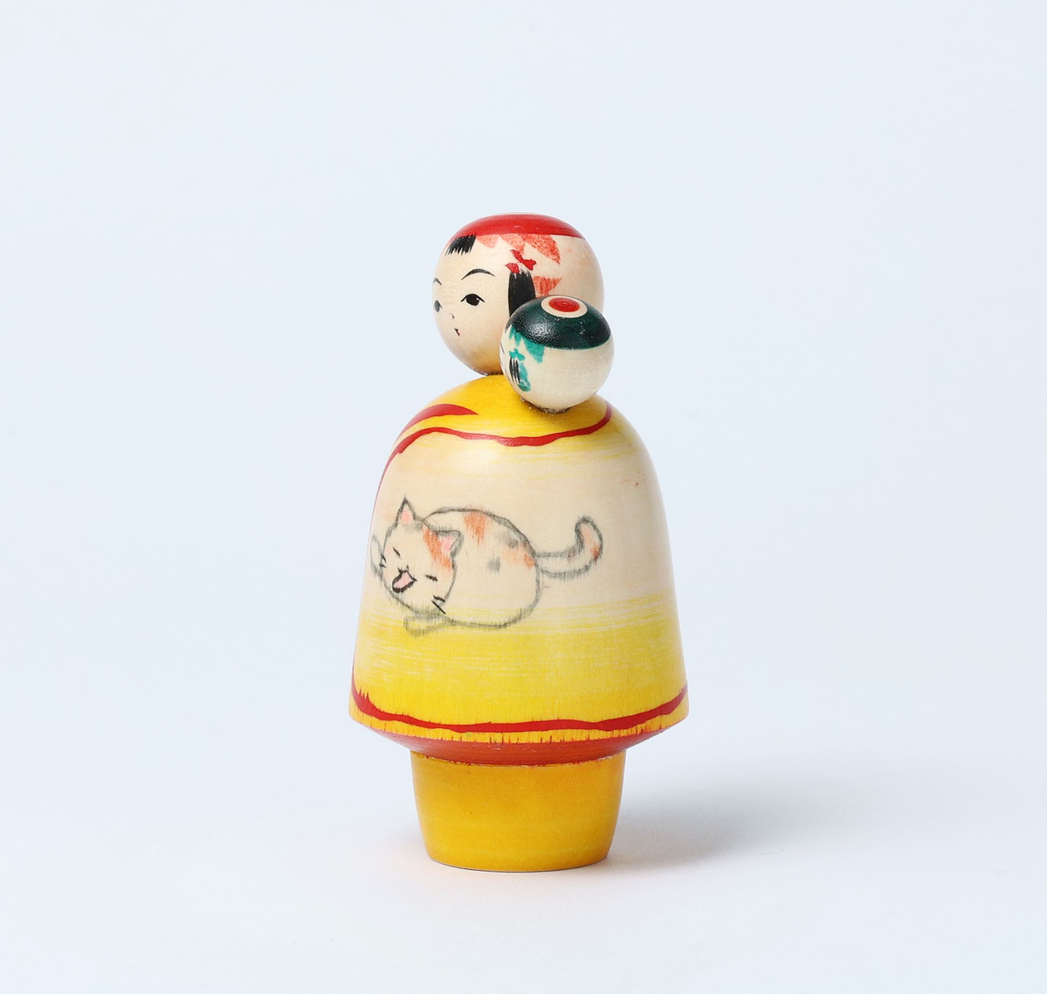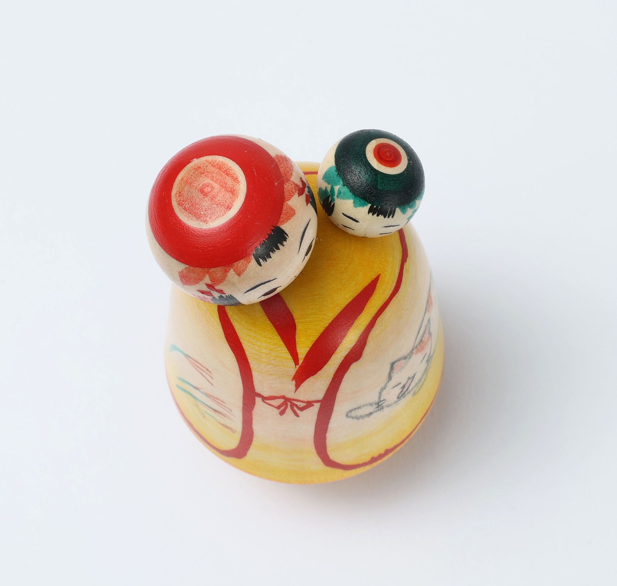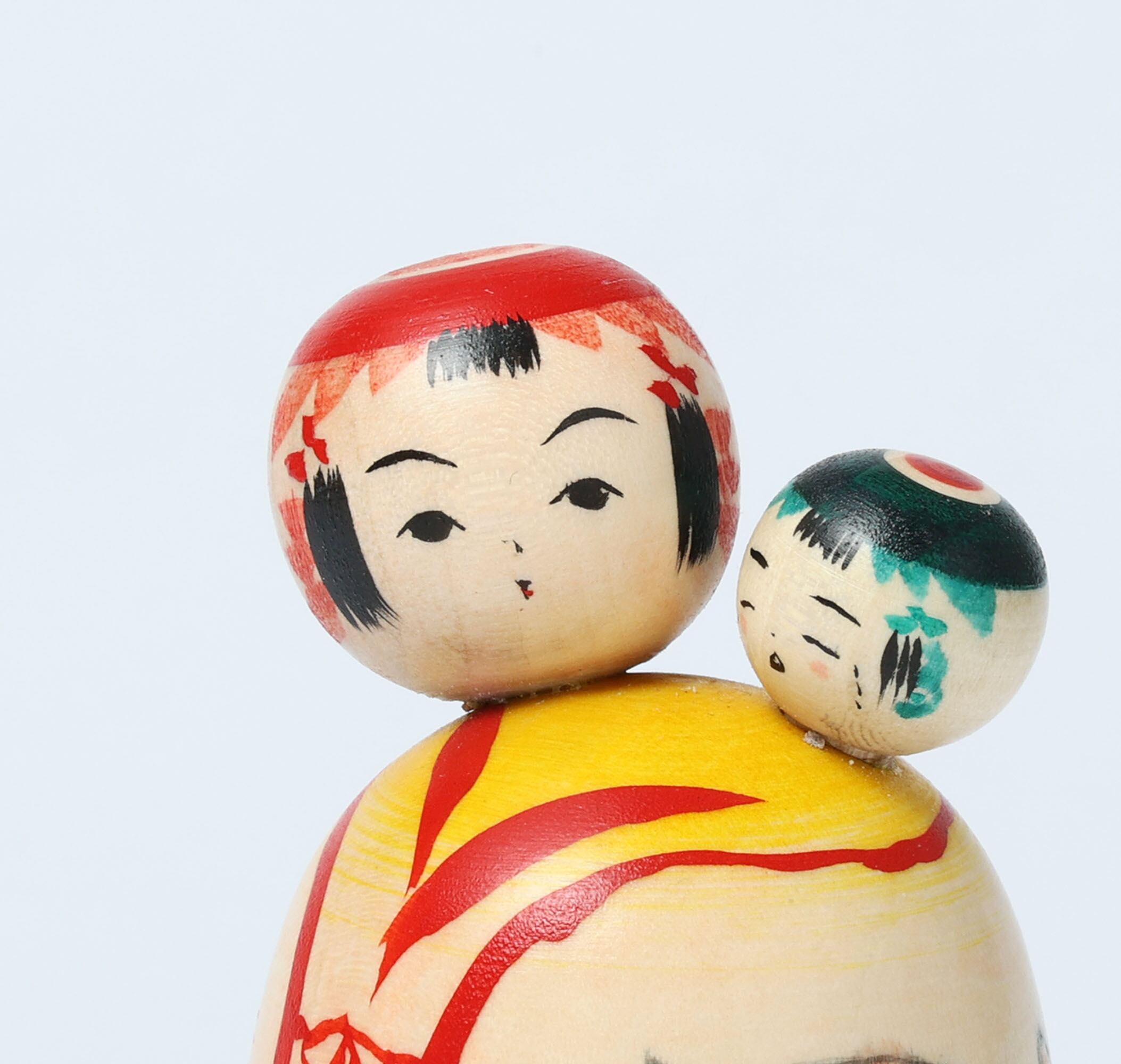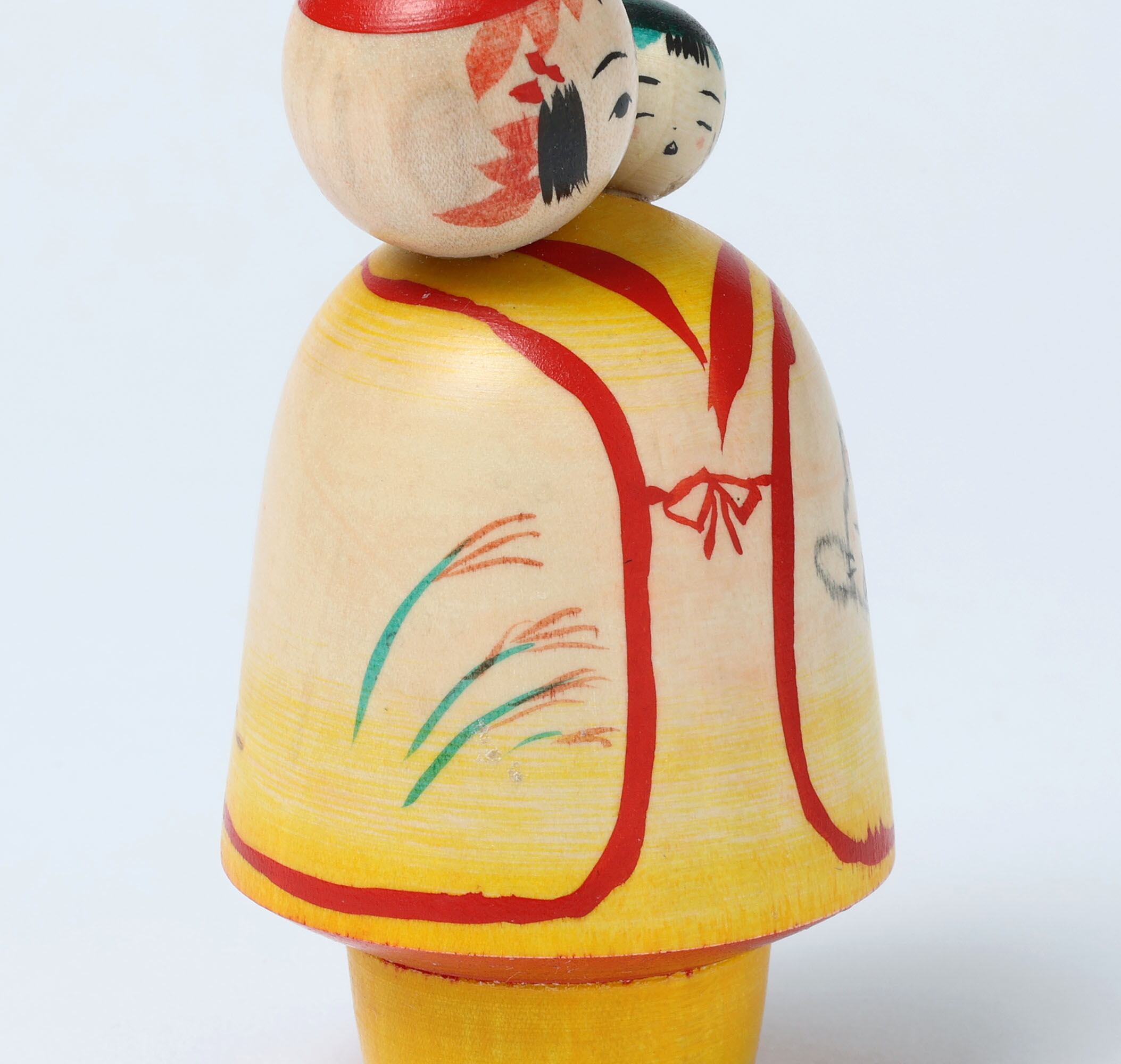 This is a komori-babysitting kokeshi doll, by NIIYAMA Mayumi who is a Yajiro style kokeshi craftsperson.