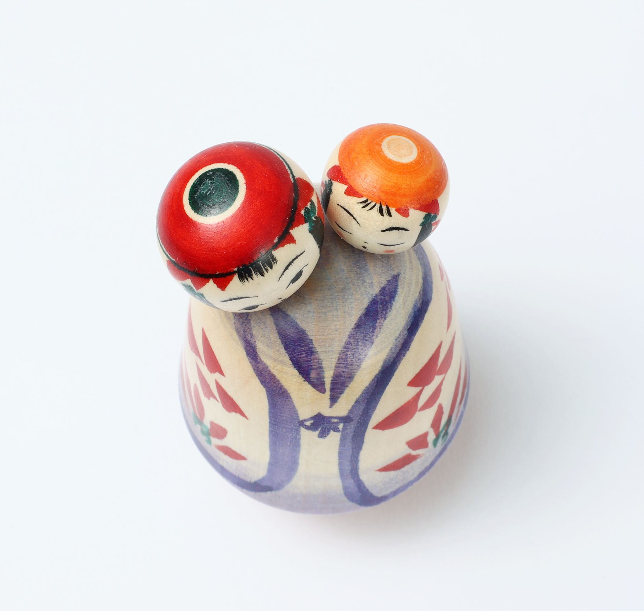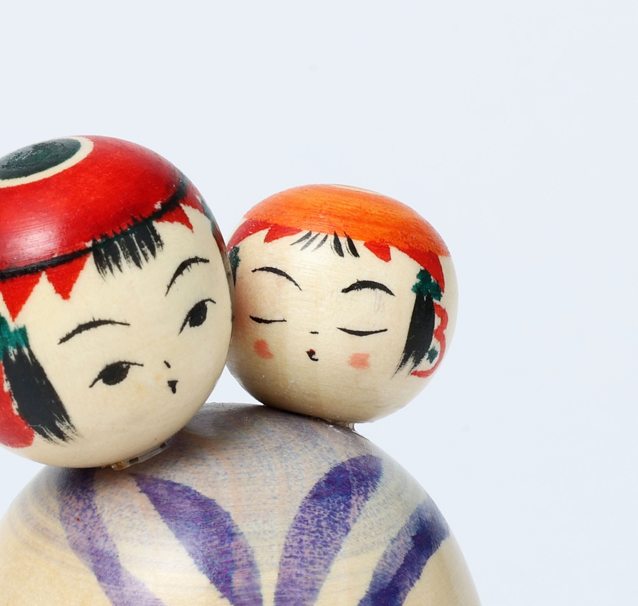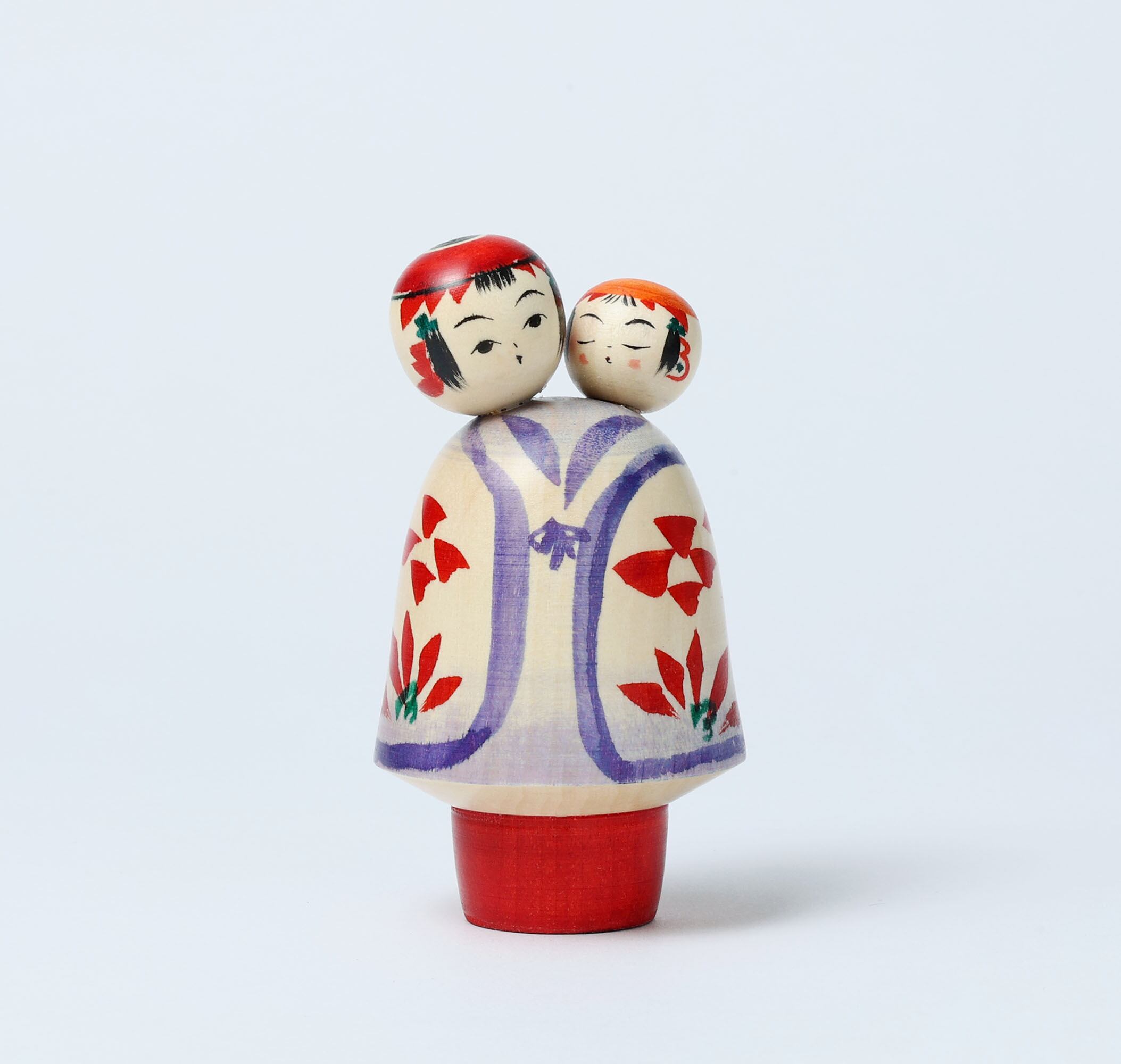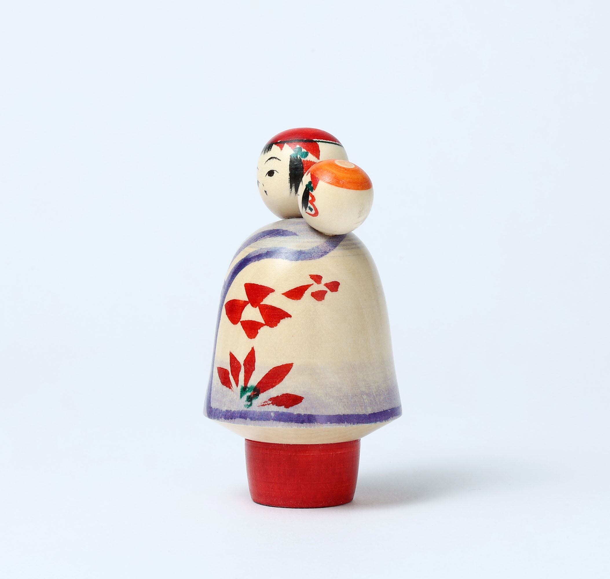 The sleeping baby kokeshi on her babysitter, makes us calm and peaceful. The baby is covered by a cute kimono coat.