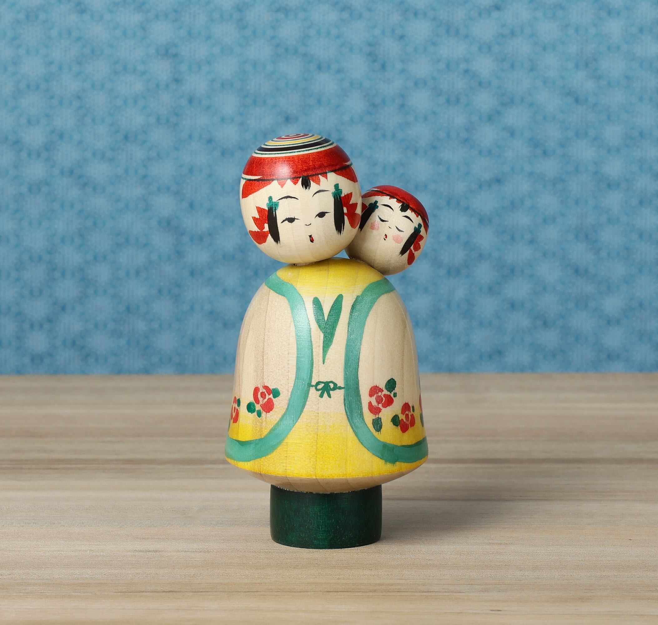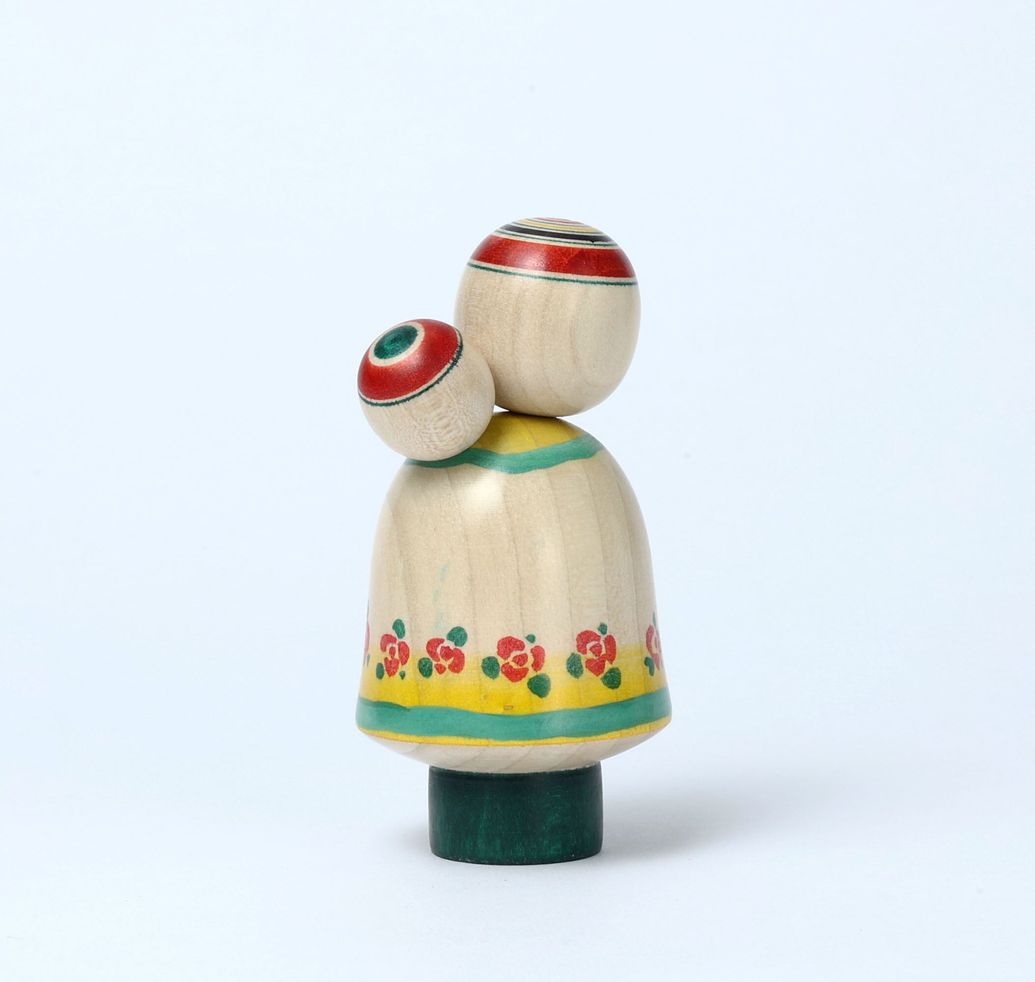 This is a babysitting kokeshi doll, by IKEUCHI Shione who is a Yajiro style kokeshi craftsperson.