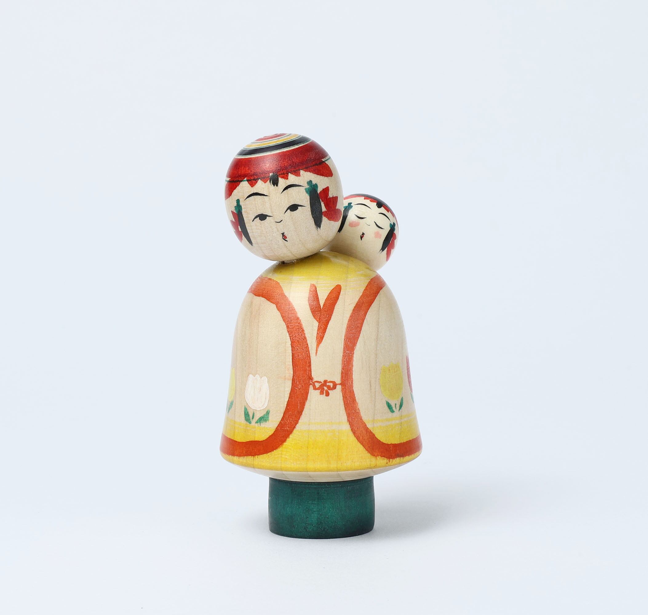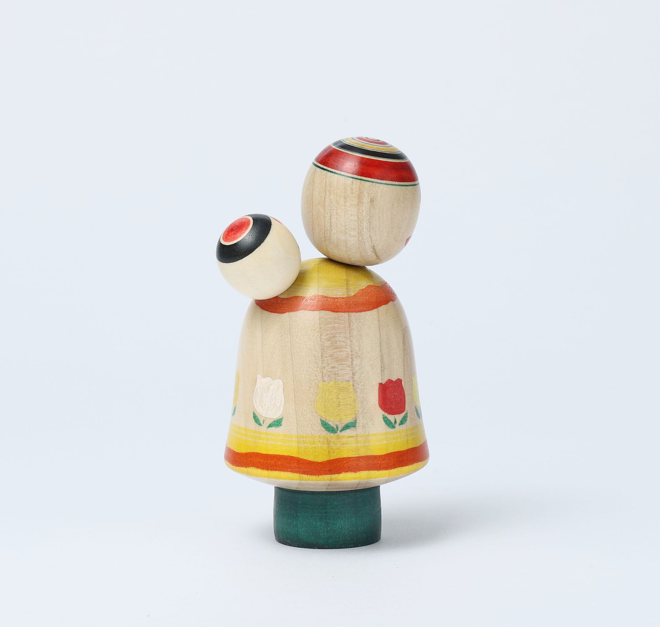 This is a babysitting kokeshi doll, by IKEUCHI Shione who is a Yajiro style kokeshi craftsperson.