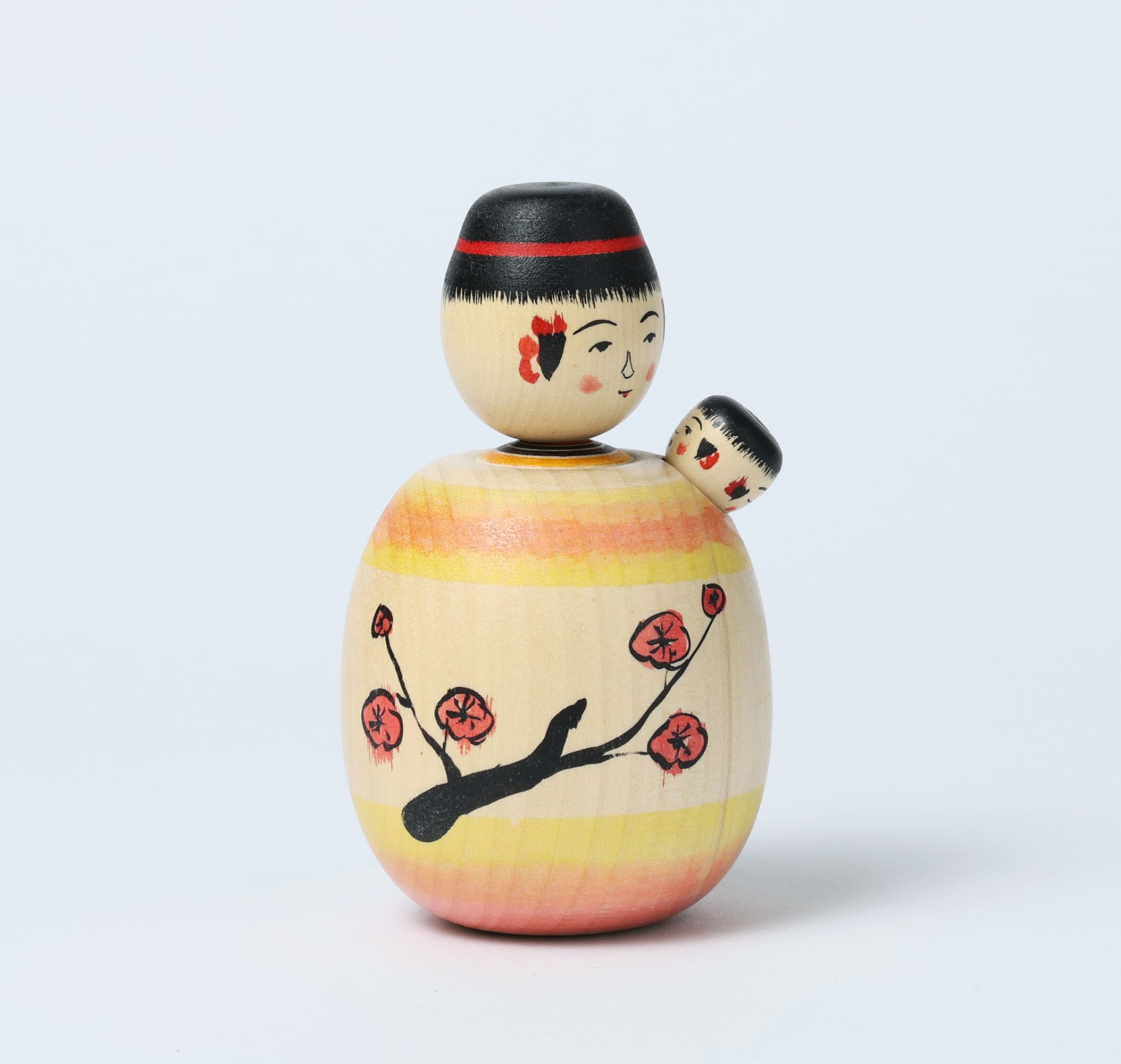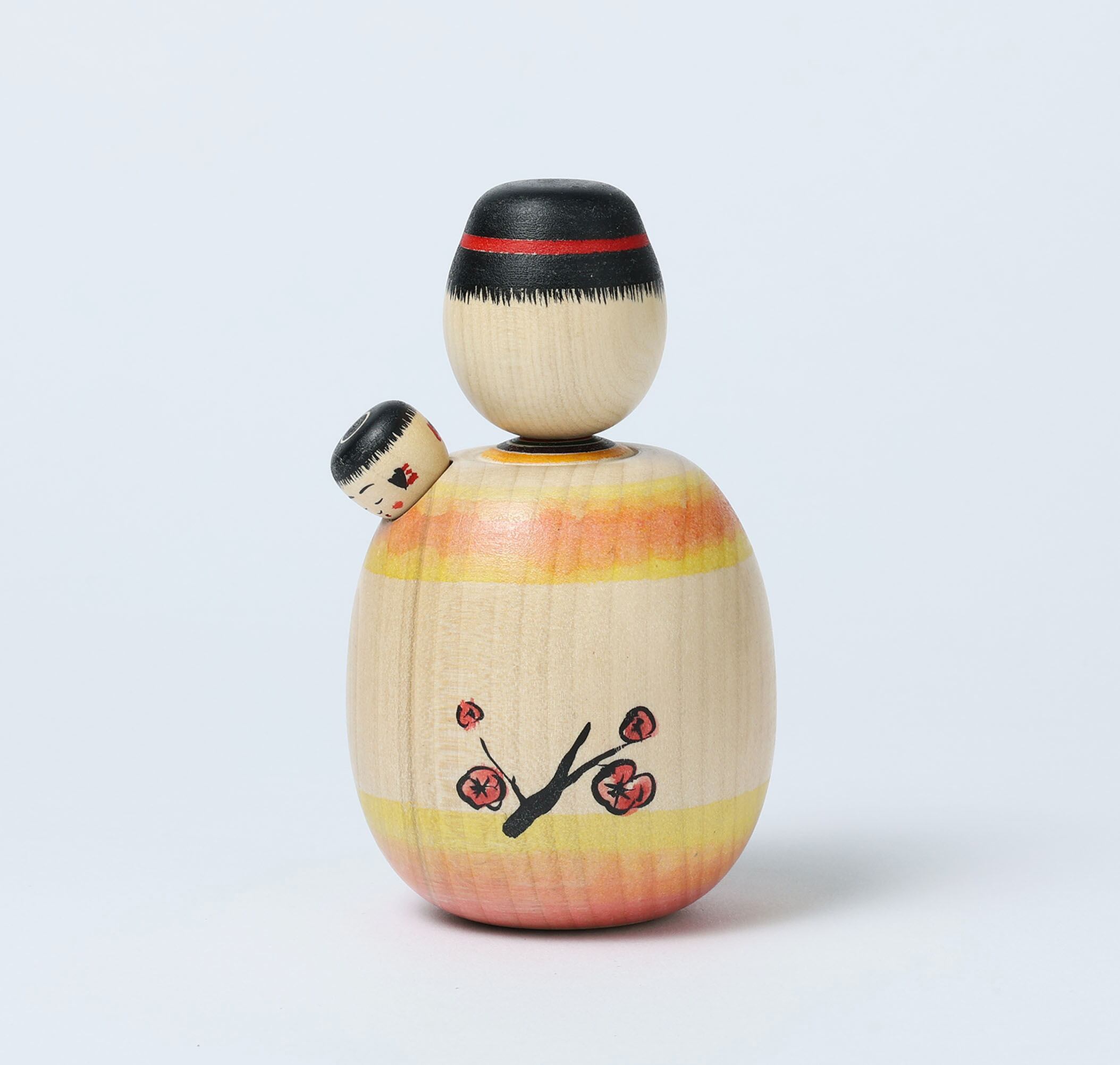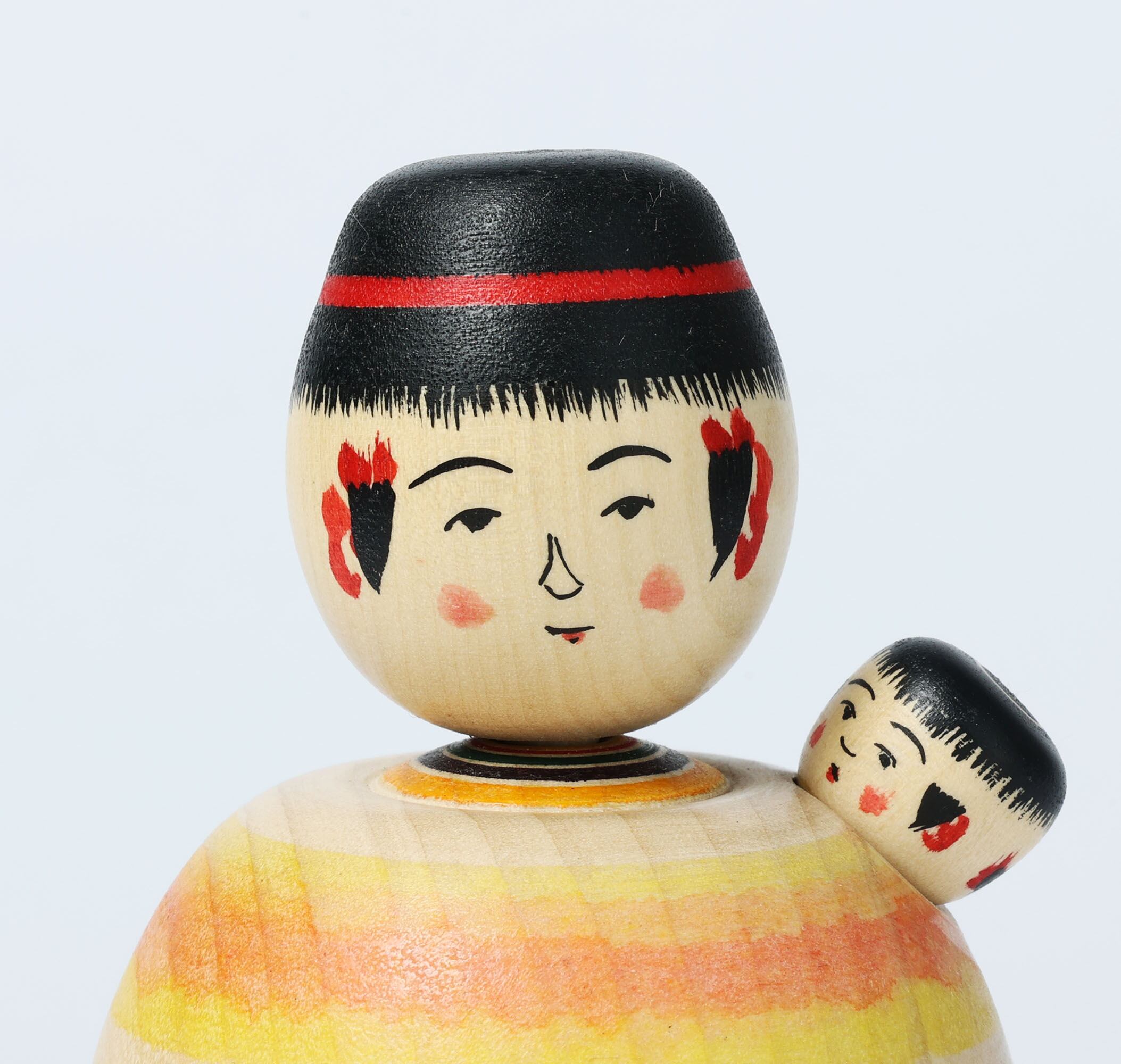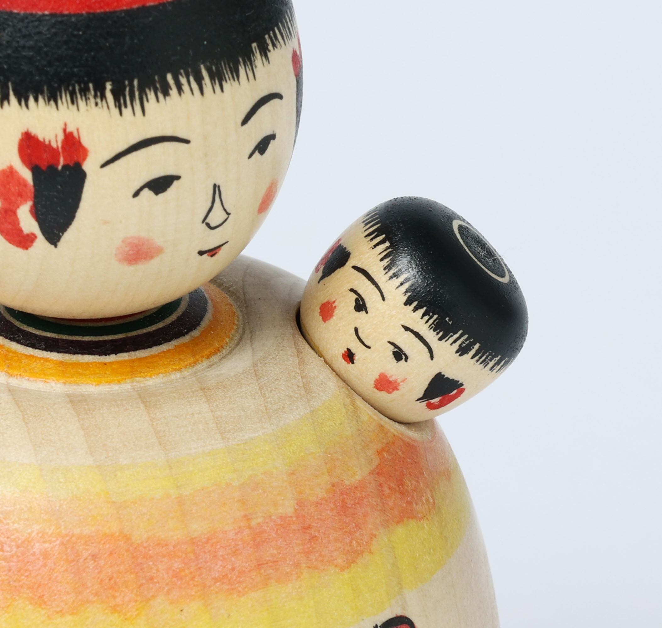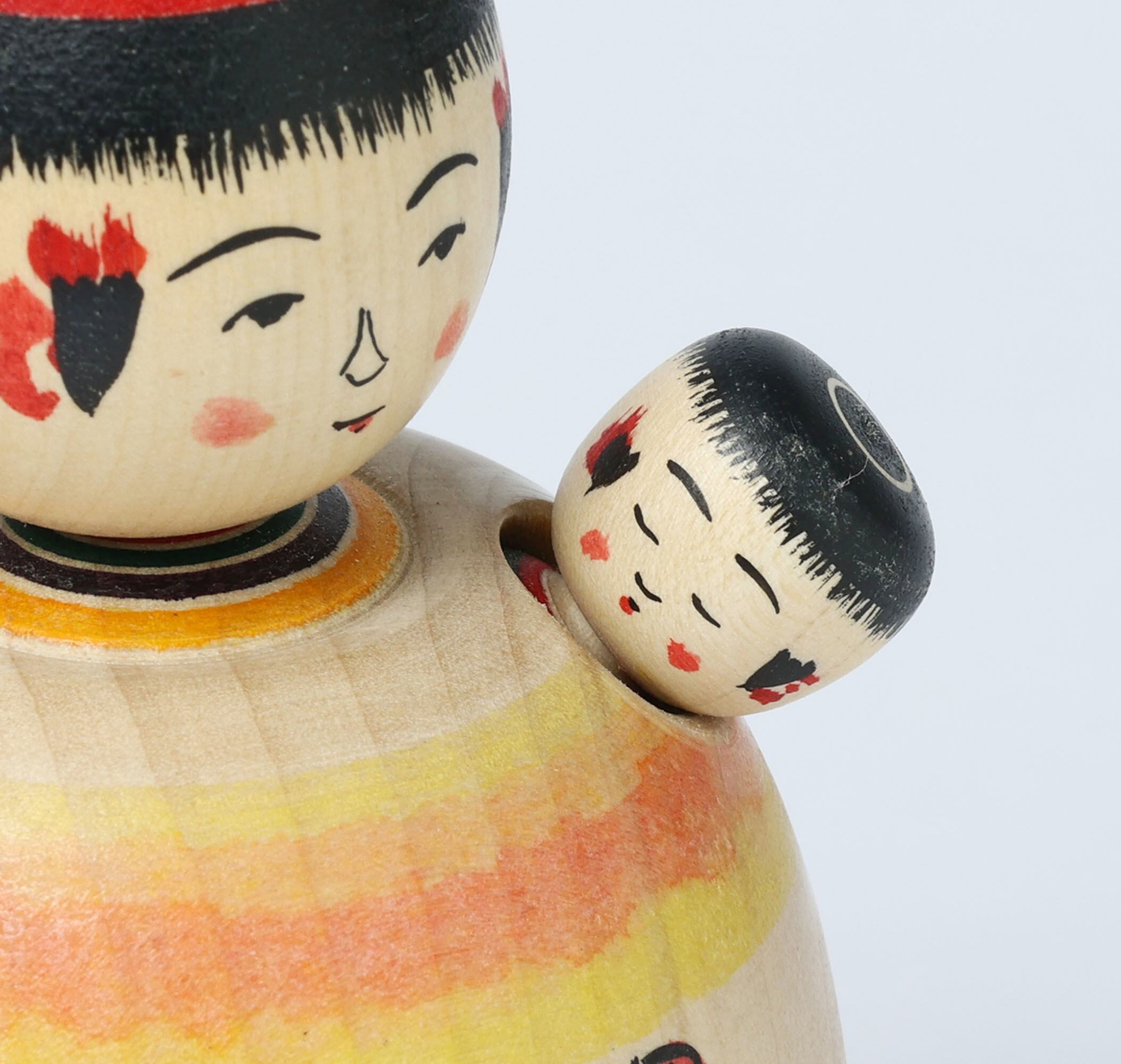 This is a komori-babysitting kokeshi doll, by SATO Seiko who is a Yajiro style kokeshi craftsman. It represents a kokeshi doll piggybacking a baby.