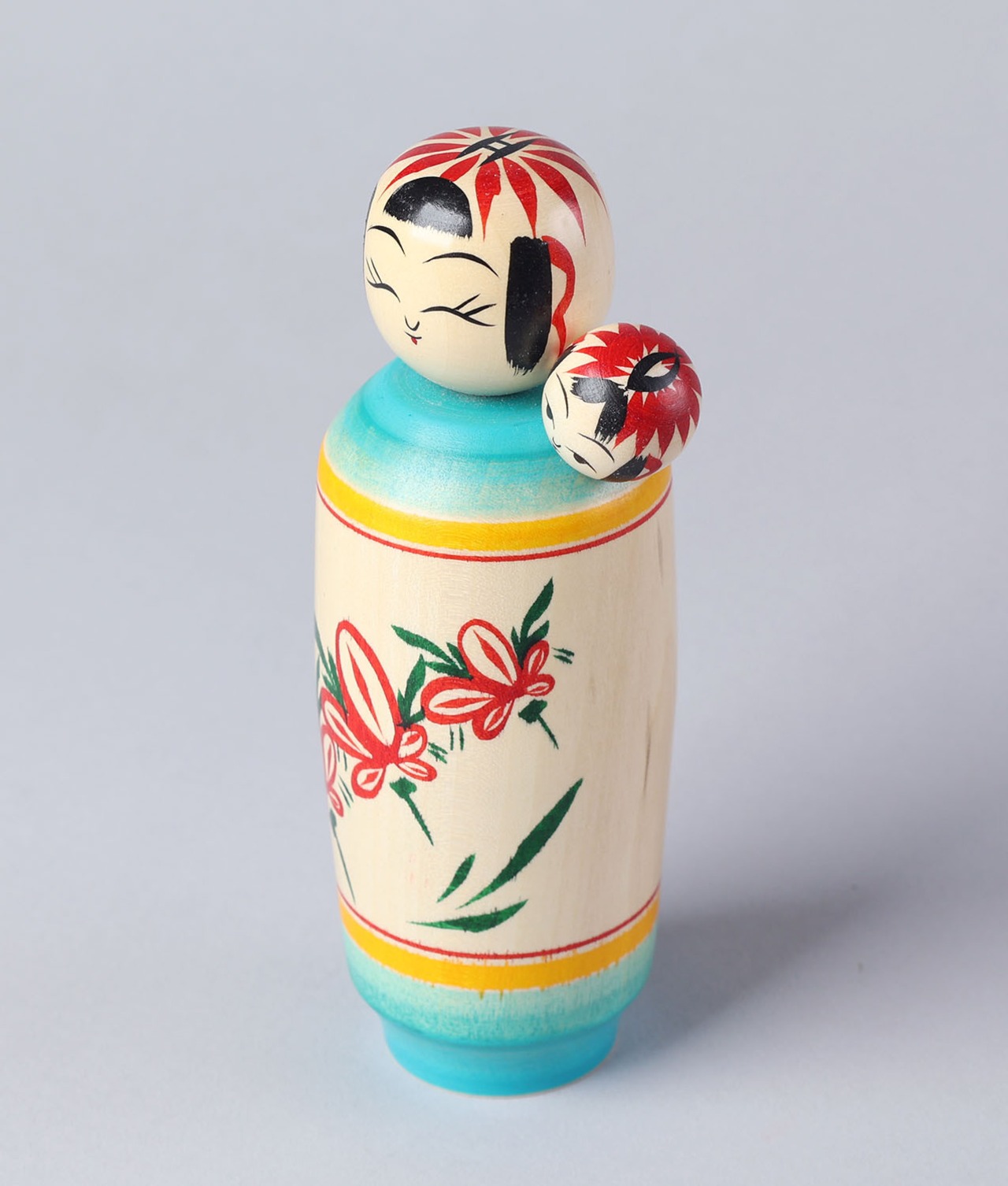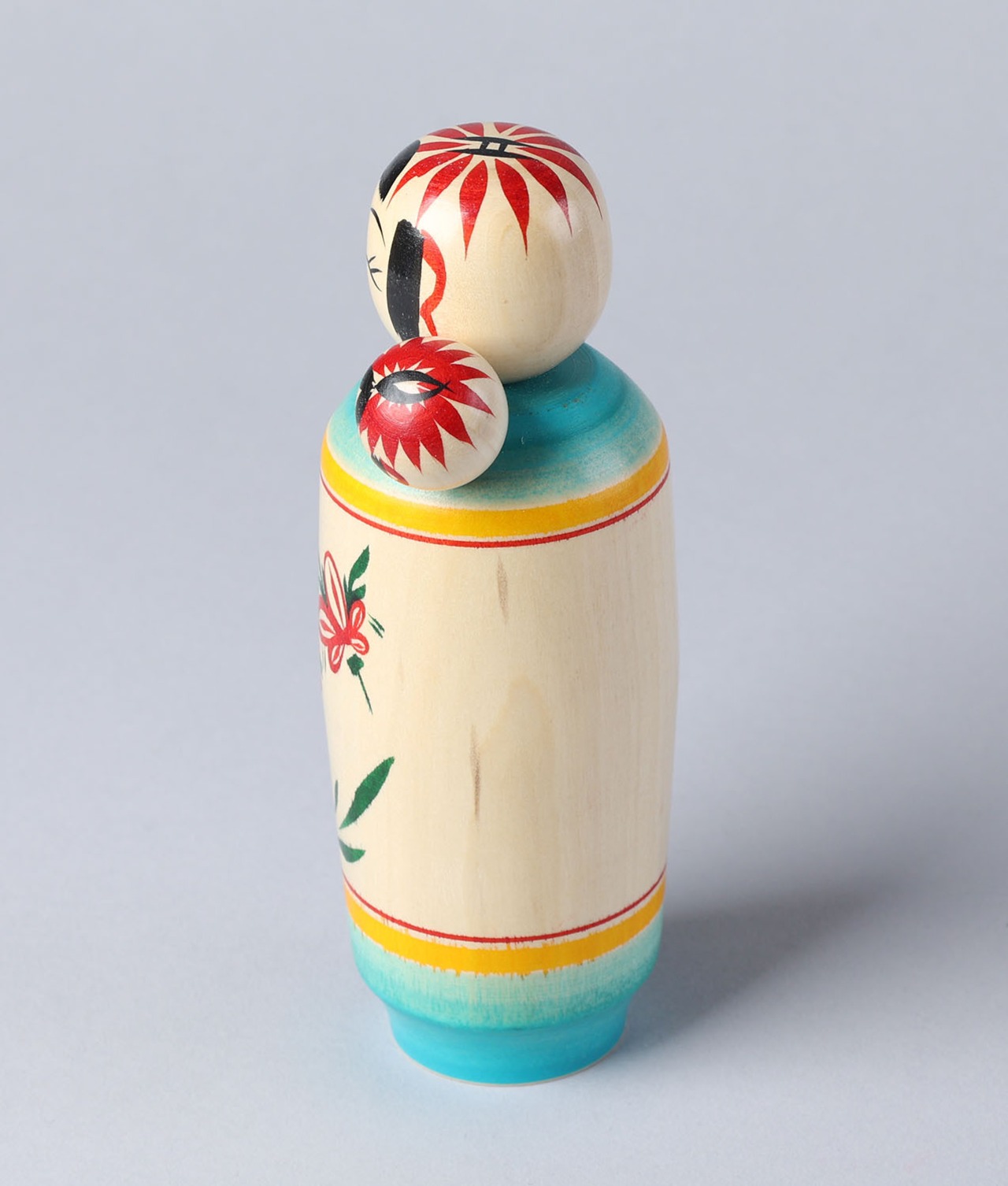 満面の笑みに、顔を出した赤ちゃんこけしが何とも愛らしいこけしです。