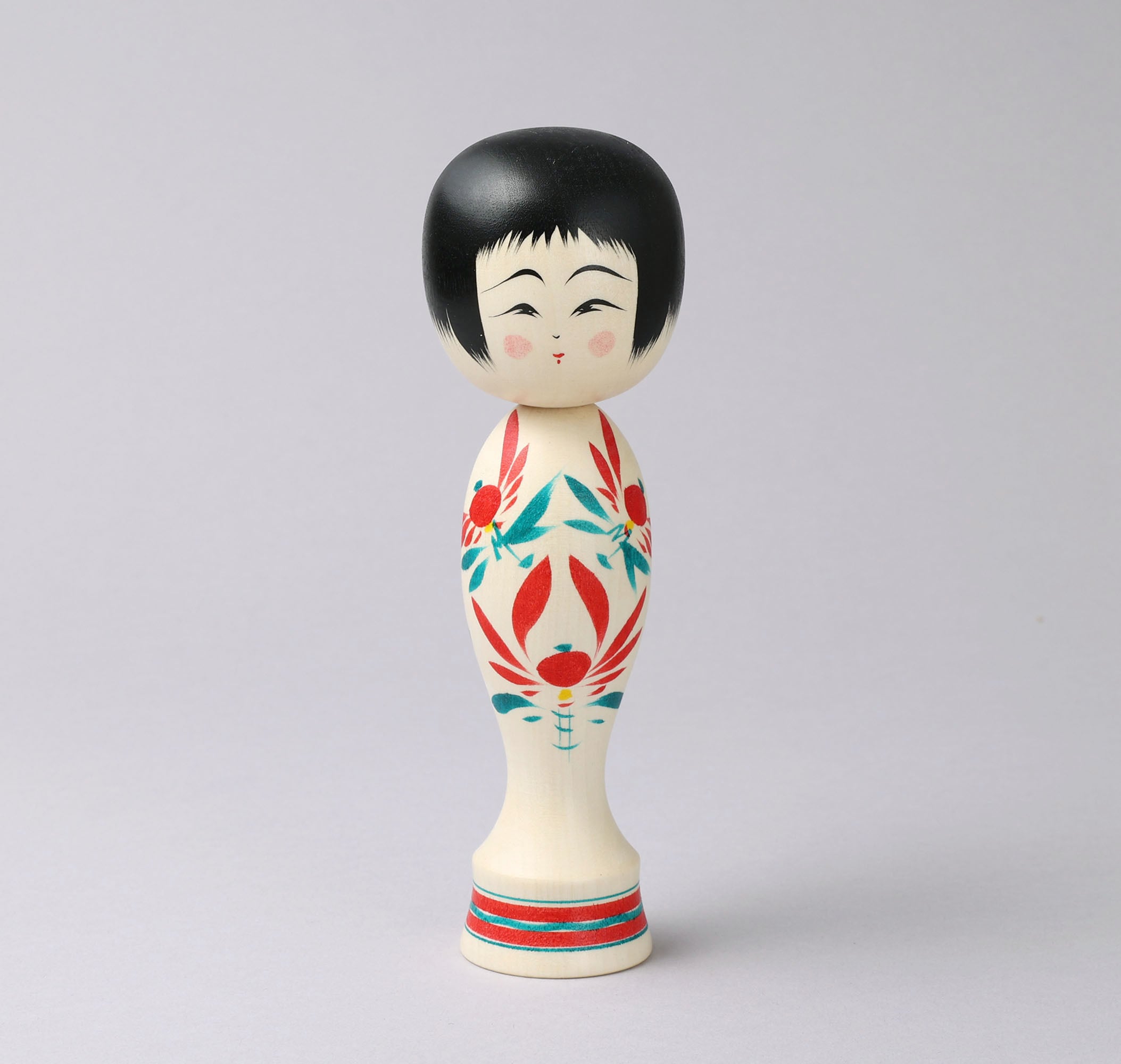 まるで羽ばたく鳥のようにも見える作並こけしのカニ菊模様と、おかっぱ頭のかわいい子です。