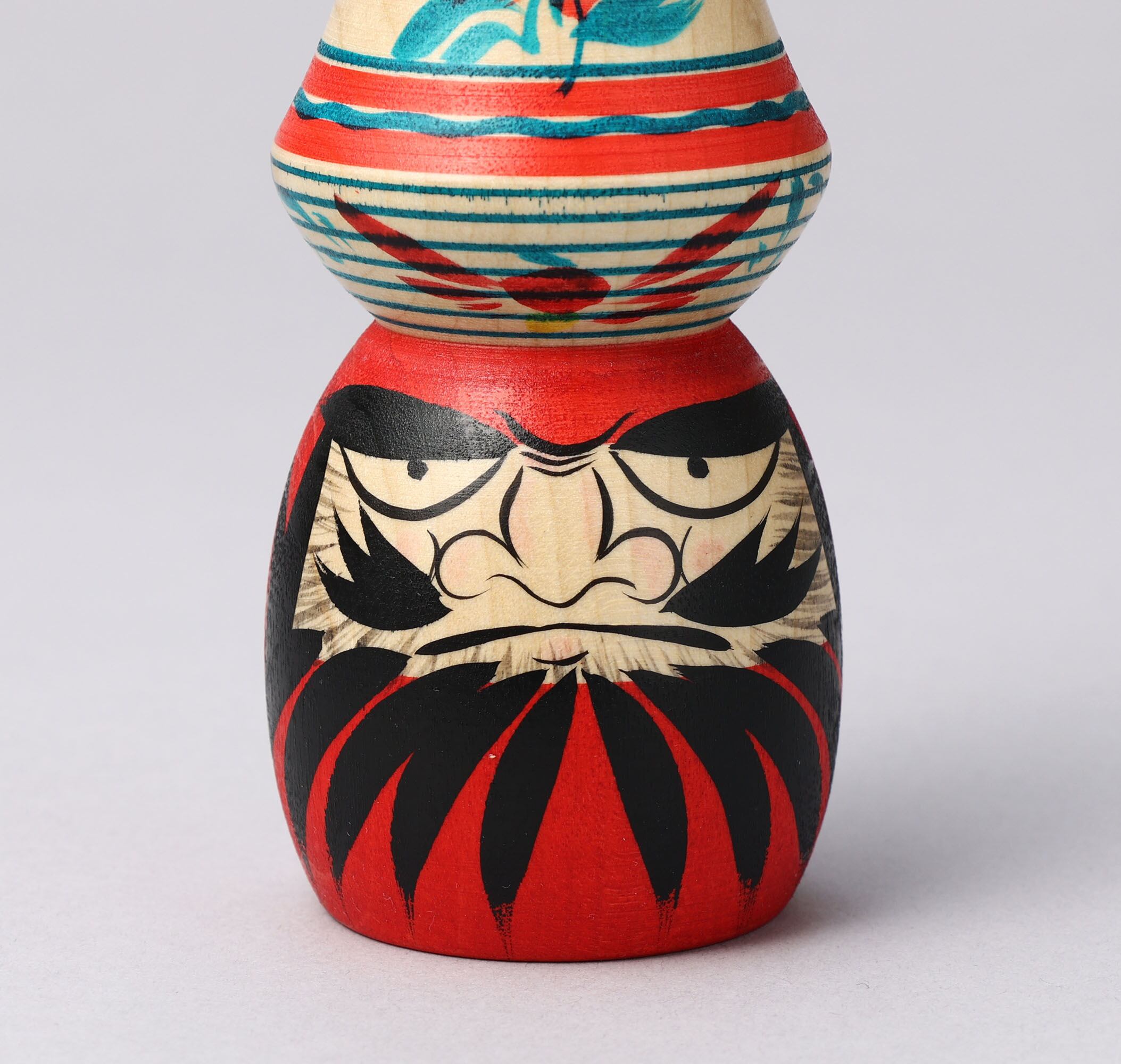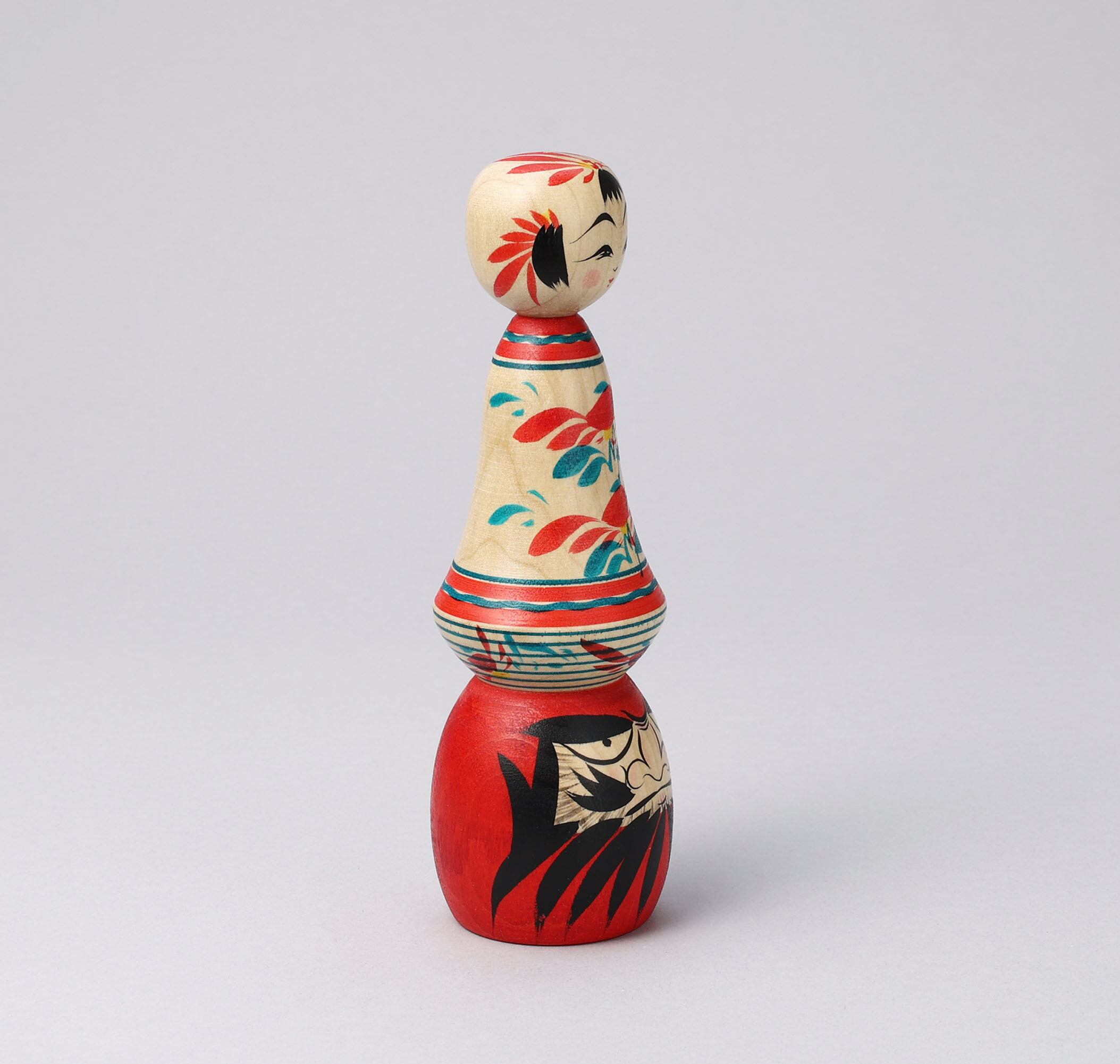 かわいいこけしと、だるまのいかつい表情のコントラストが楽しいこけしです。