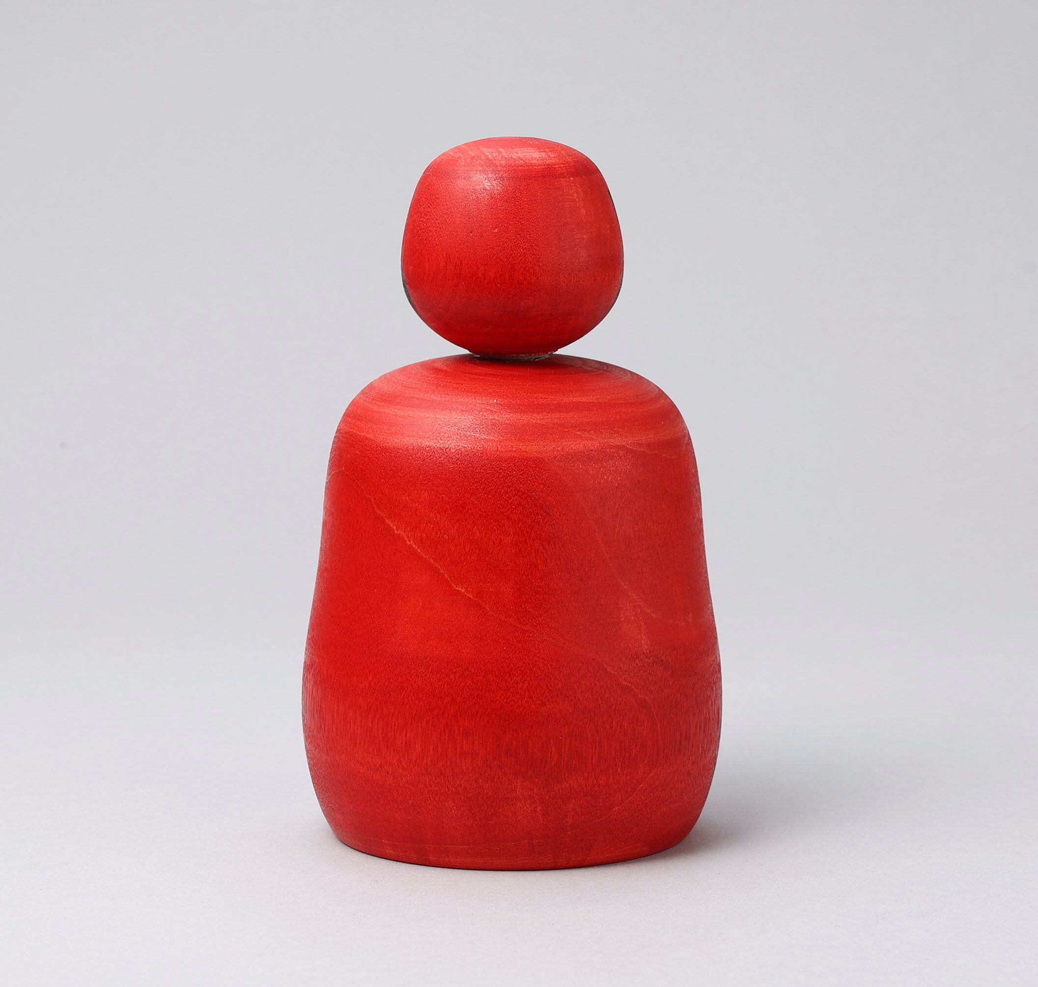 This is a kokeshi doll, which is standing on a Daruma, by Teruyuki HIRAGA who is a Sakunami style kokeshi craftsman in Tohoku, Japan.