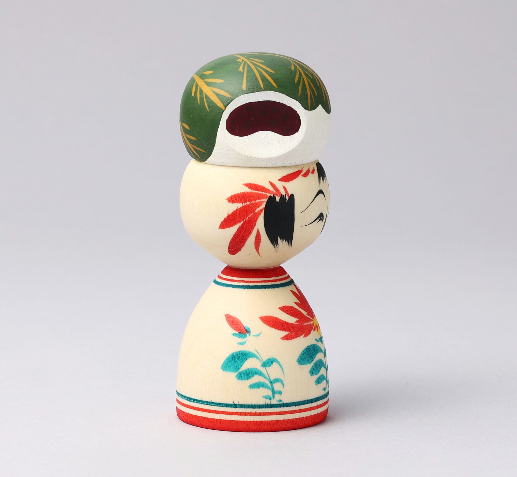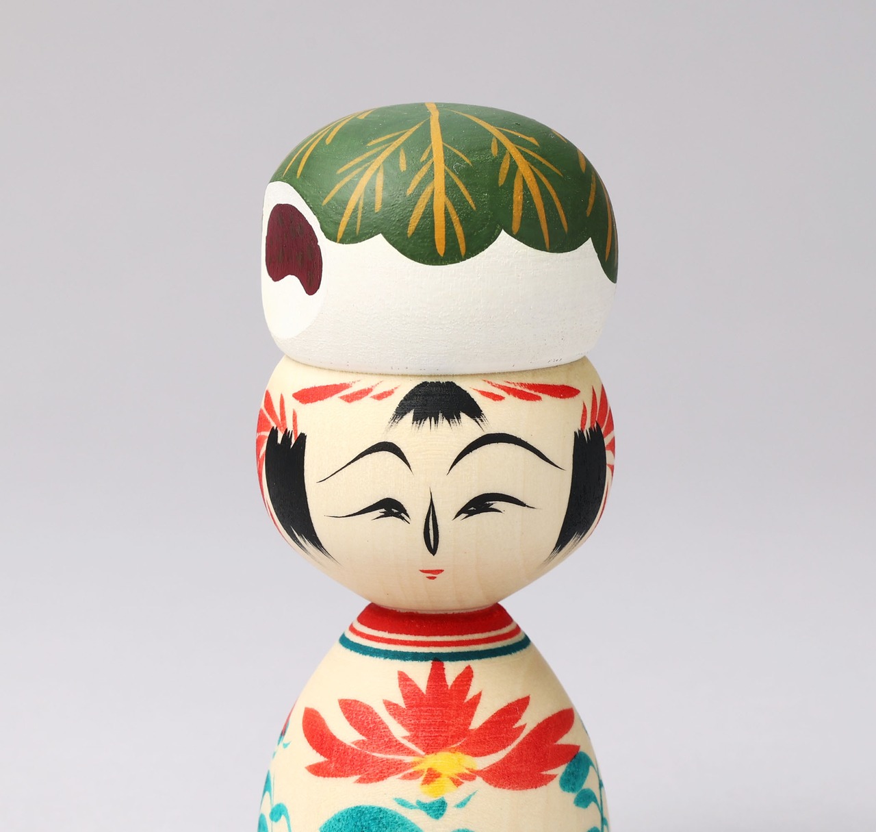 This is a novelty Kashiwa mochi kokeshi doll, by Teruyuki HIRAGA (1972-) who is a Sakunami style kokeshi craftsman.
